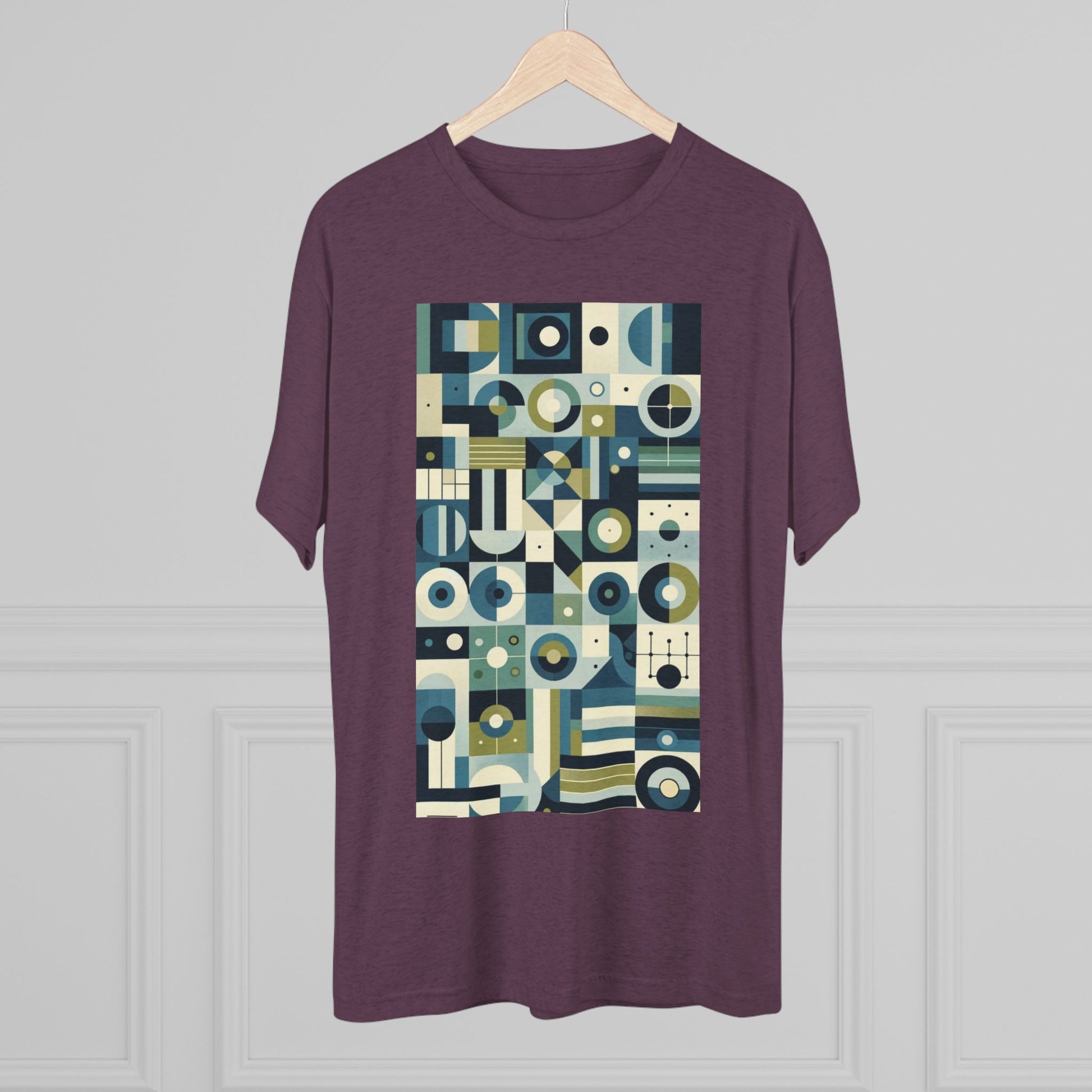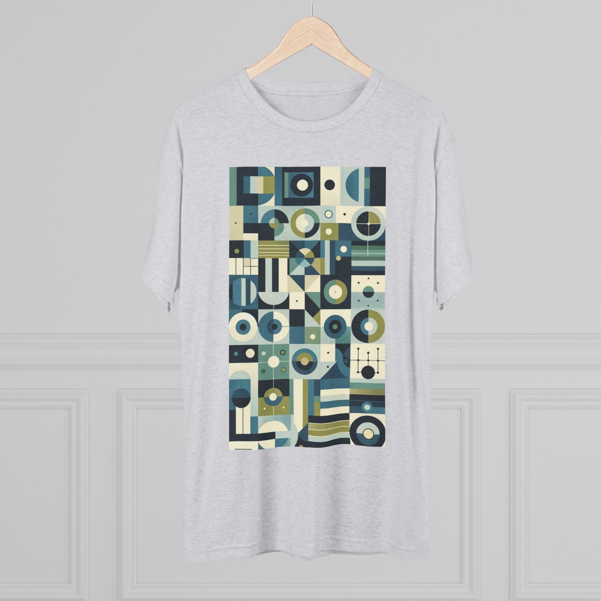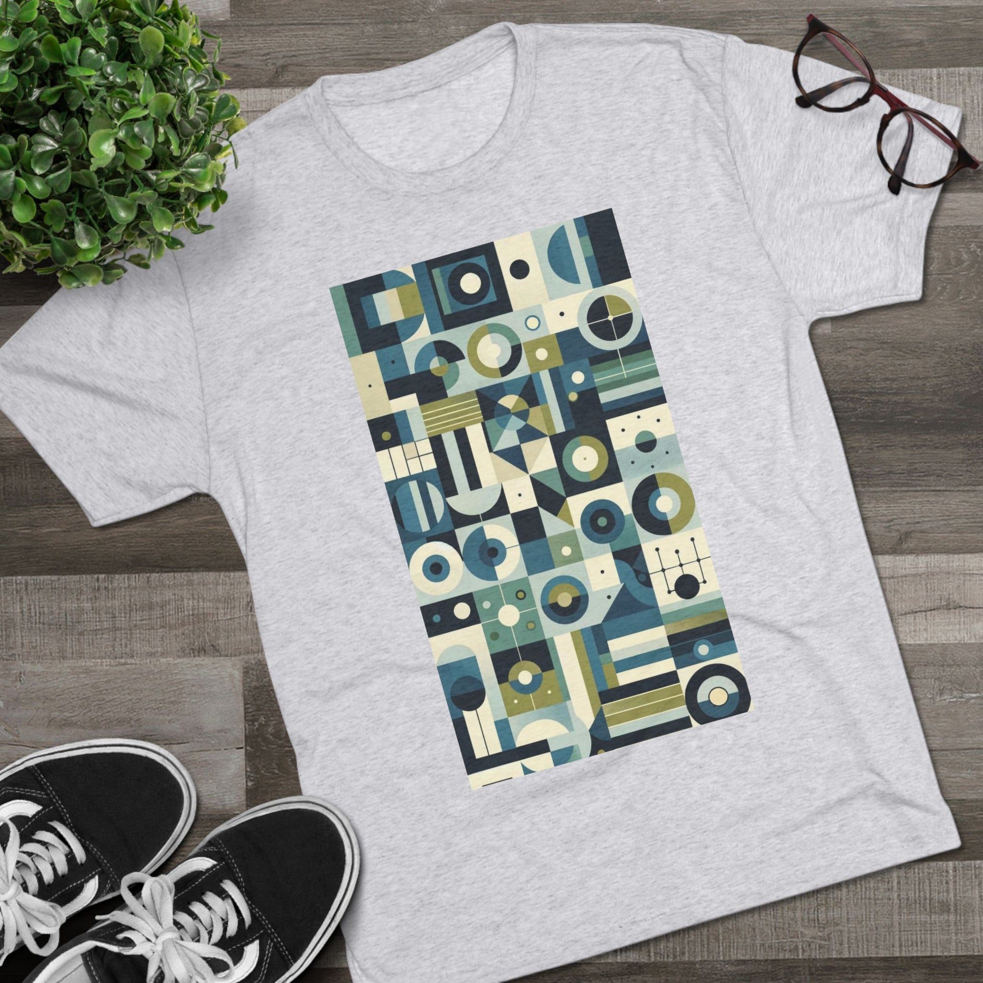 Show off your modern edge with this Geometric Abstract Tee! Featuring a striking vertical panel of retro-inspired shapes, lines, and circles in cool, muted tones, this shirt turns minimalist art into wearable style. The bold, blocky design pops against a soft heather gray background, making it a standout piece for creative thinkers and trendsetters alike.
