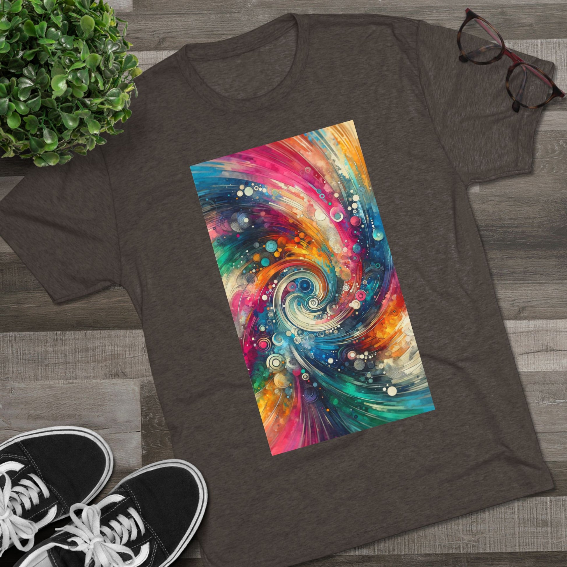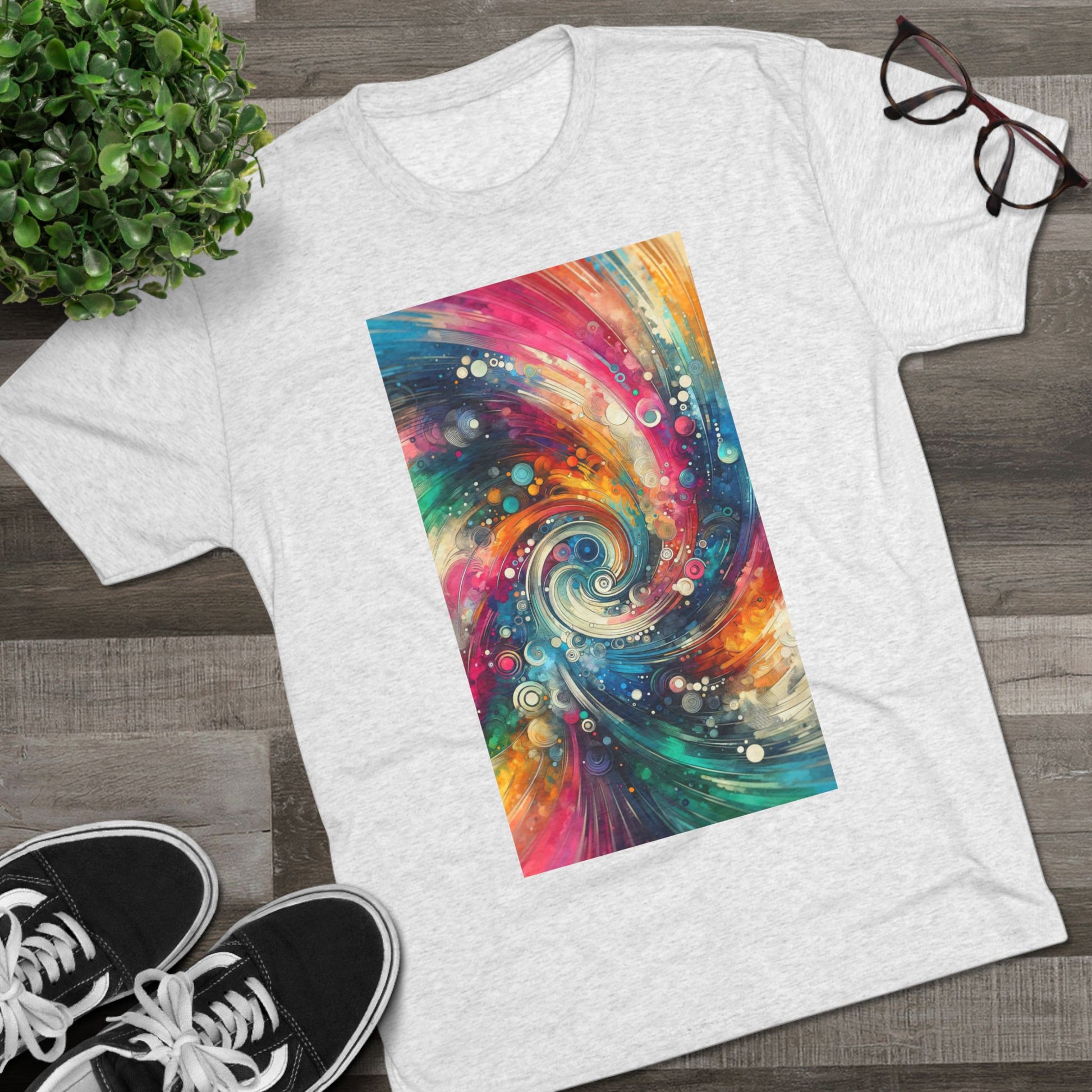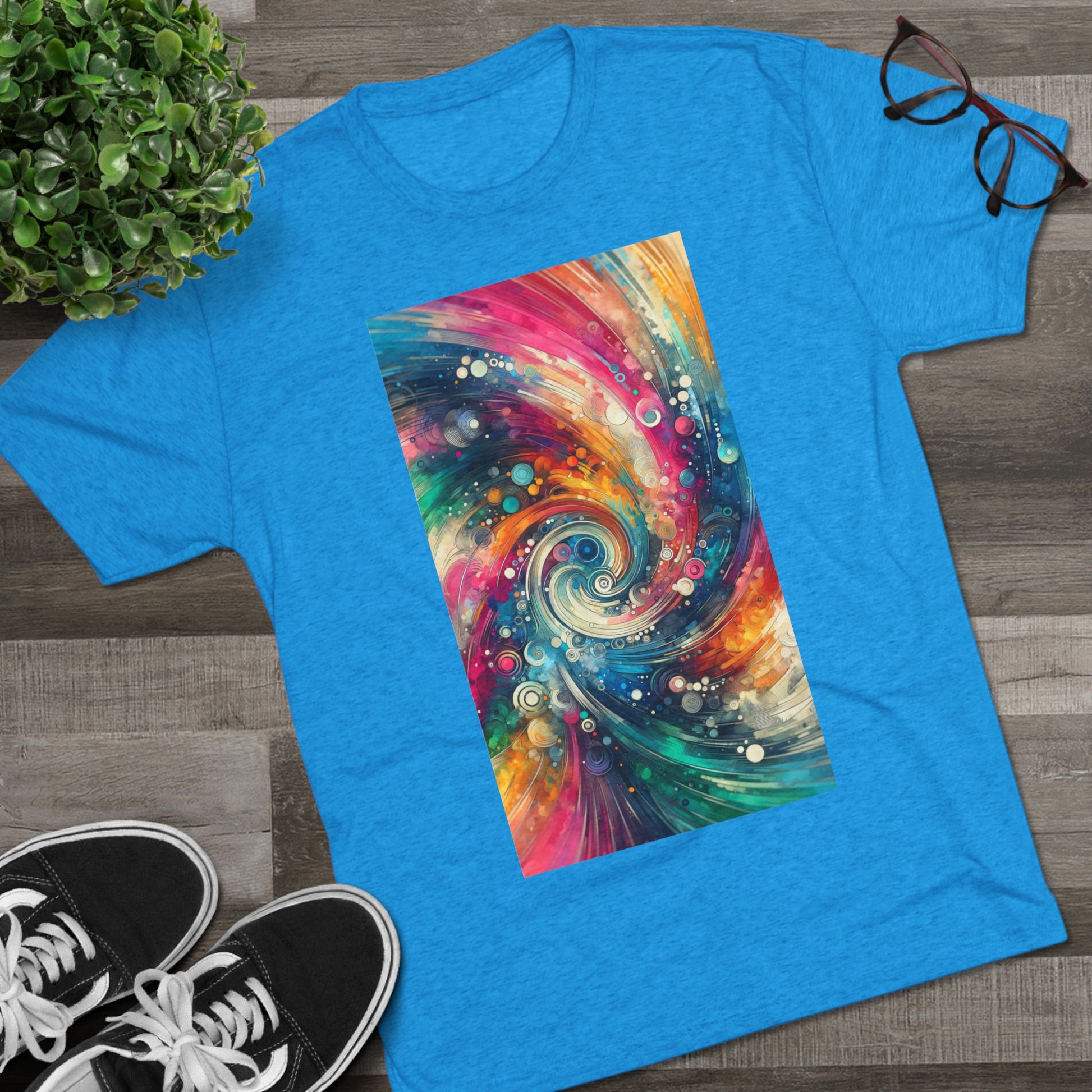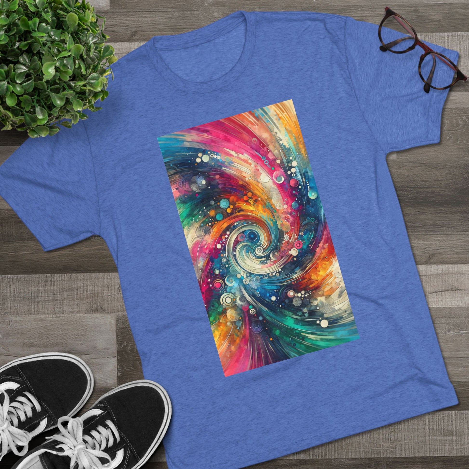 This lightweight crew brings a burst of color to everyday wear. A swirl of saturated blues, pinks, oranges and greens sits at the center, like a painted vortex that moves with you. The fabric drapes softly against skin and keeps its shape thanks to shoulder tape and side seams. Wear it on gallery nights, festival afternoons, or quiet coffee runs — it reads like wearable art that sparks conversation and lifts mood. For people who chase color and creative energy, this tee becomes a simple ritual: slip it on, feel comfortable, and carry a little playful momentum through the day.