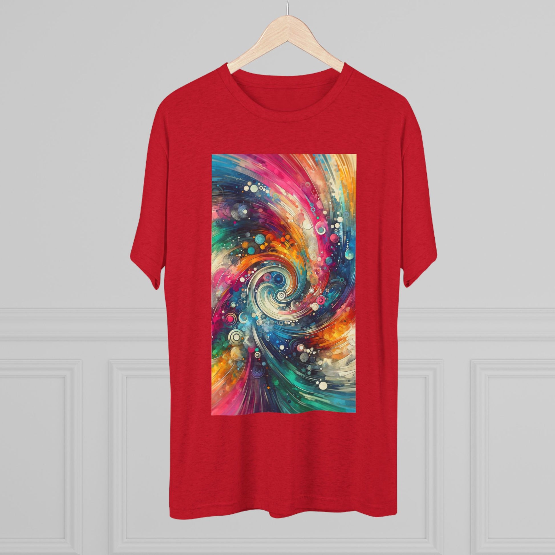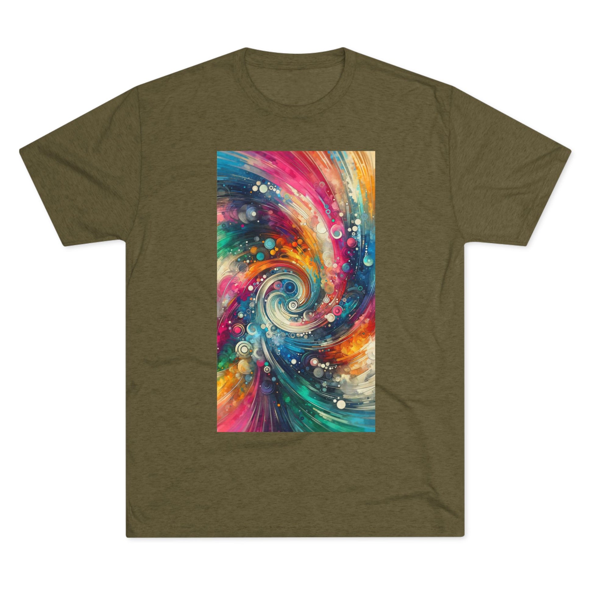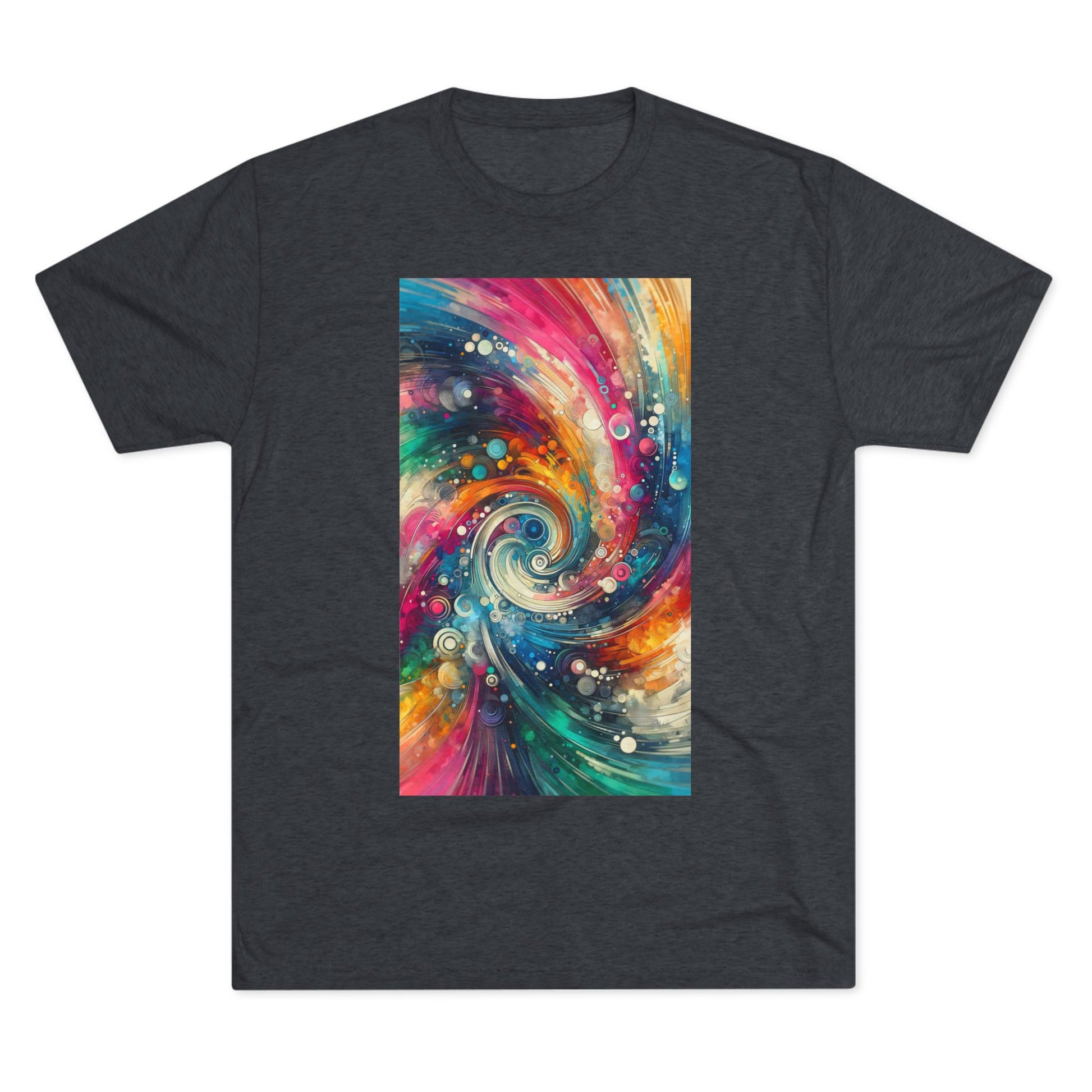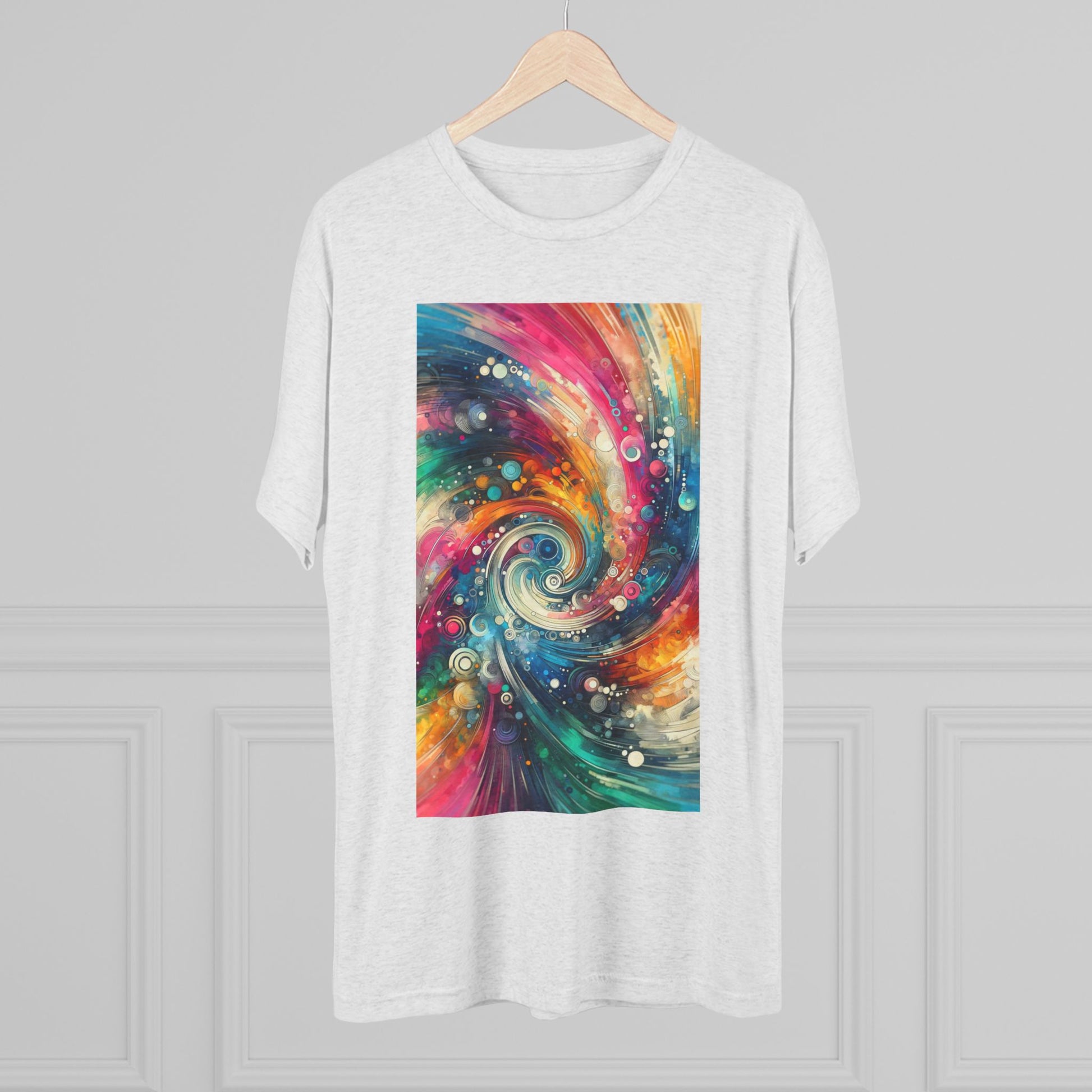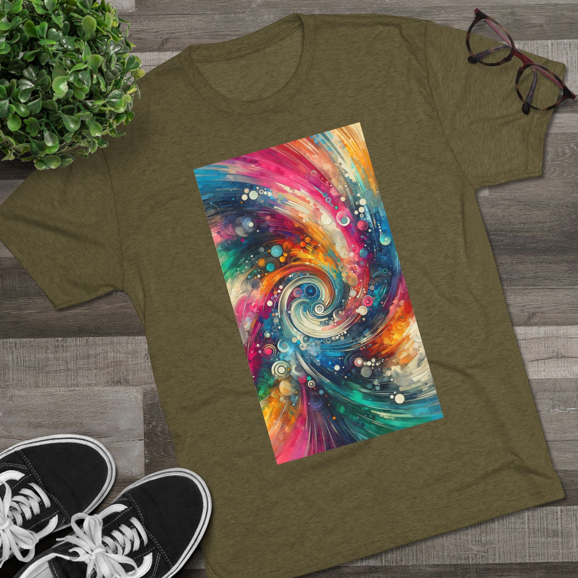 This lightweight crew brings a burst of color to everyday wear. A swirl of saturated blues, pinks, oranges and greens sits at the center, like a painted vortex that moves with you. The fabric drapes softly against skin and keeps its shape thanks to shoulder tape and side seams. Wear it on gallery nights, festival afternoons, or quiet coffee runs — it reads like wearable art that sparks conversation and lifts mood. For people who chase color and creative energy, this tee becomes a simple ritual: slip it on, feel comfortable, and carry a little playful momentum through the day.