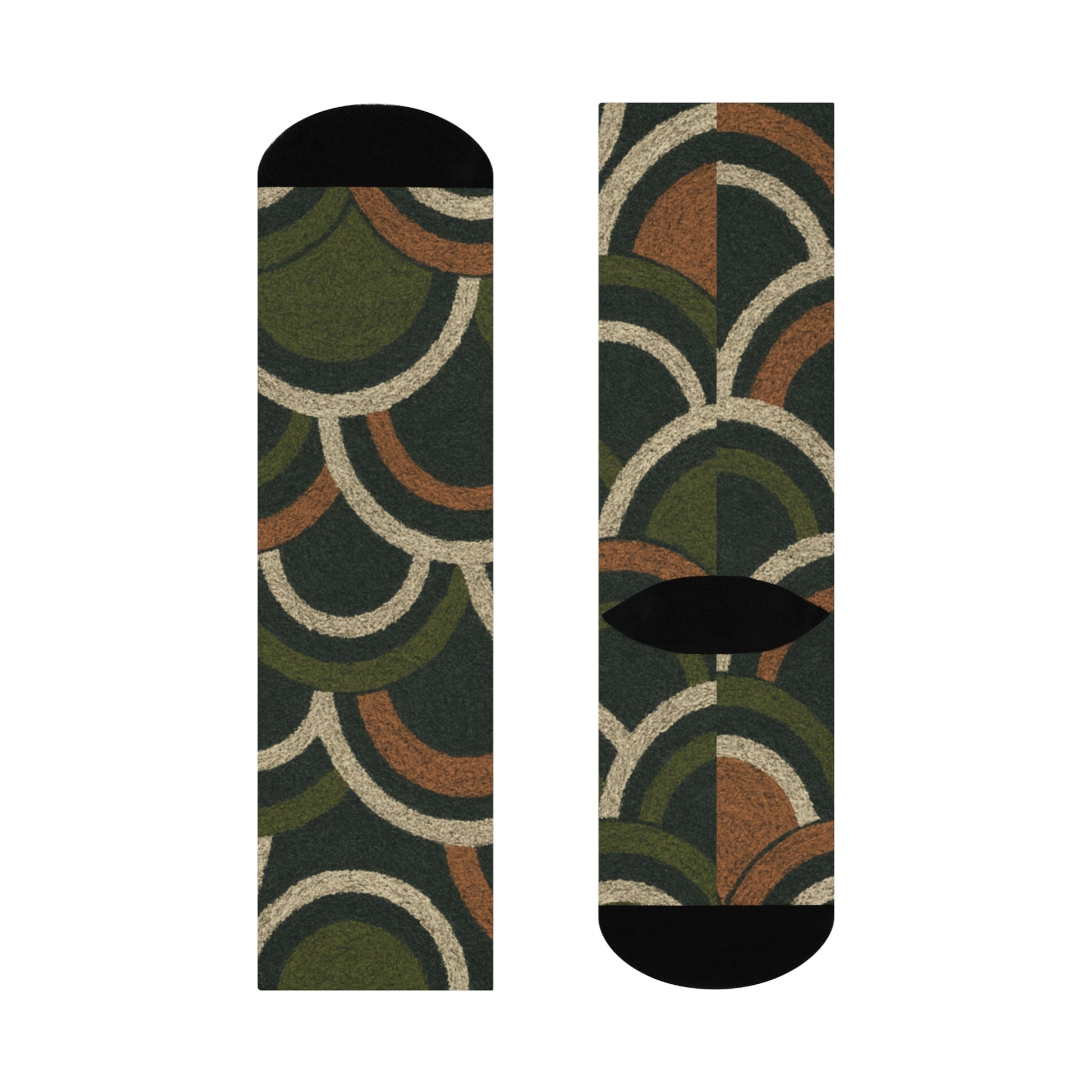 Knee-high comfort with a vintage-modern twist. These cushioned crew socks slip on like a small everyday treat — soft, stretchy, and boldly patterned in layered arches of olive, rust, and cream. The all-over print keeps the design seamless while the black heel and toe add a grounded contrast. Cushioned bottoms and a 200-needle knit give a plush underfoot feel that holds up to walking, standing, and long days on the move. Lightweight stretch fibers keep the pattern crisp and colors vibrant wash after wash. Wear them with boots, loafers, or your favorite sneakers to add a quietly confident touch to a workday, a weekend hike, or a cozy night in.