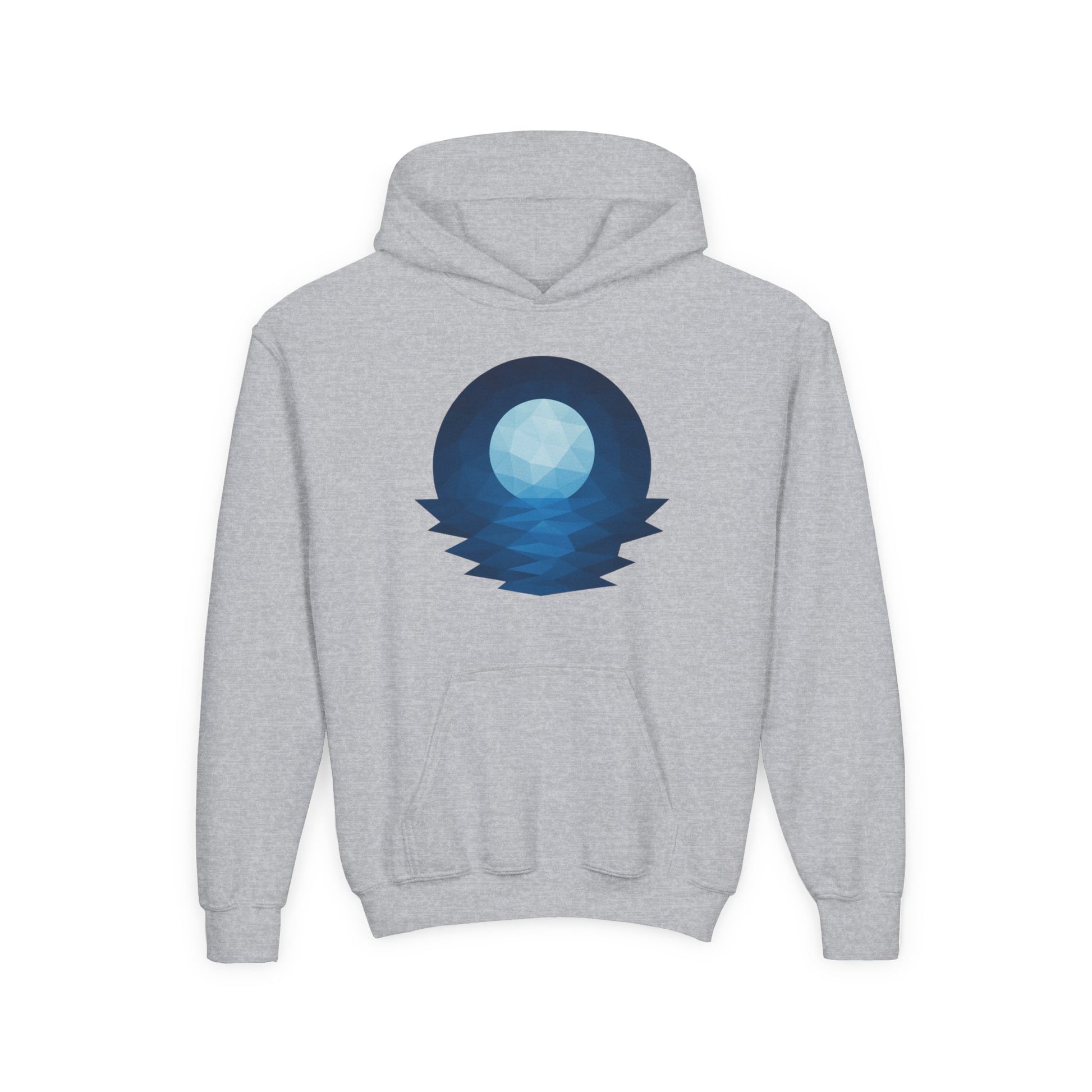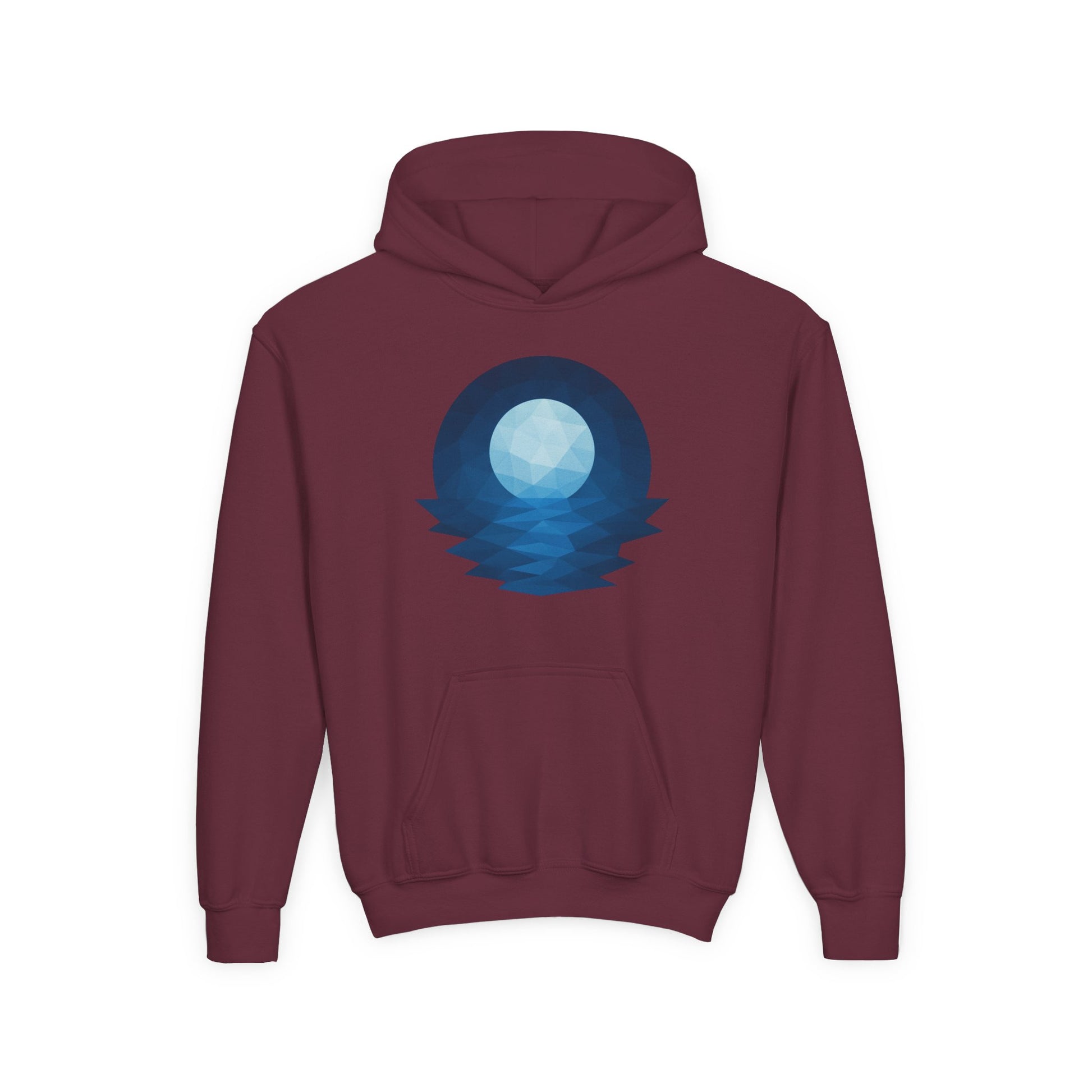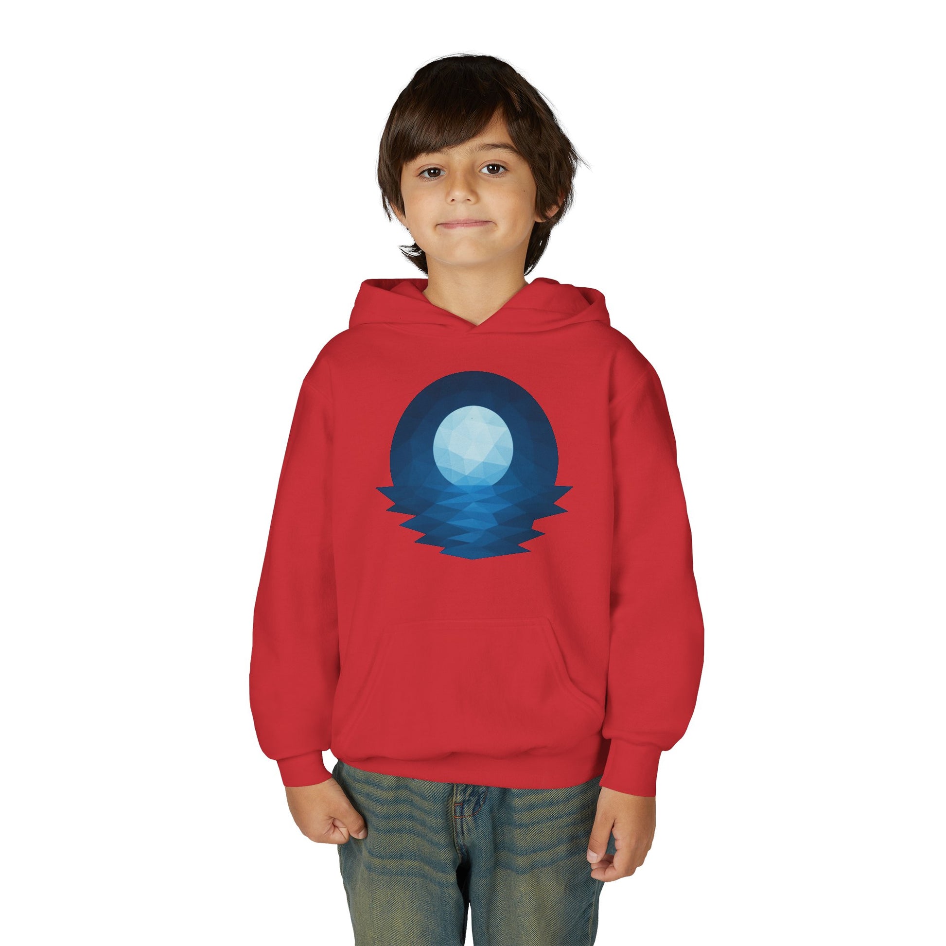 A cozy youth hoodie that brings quiet, starlit evenings to everyday play. The soft, midweight blend holds a crisp geometric moon-and-sea print on the chest, evoking calm nights by the water. Designed for kids who like simple, thoughtful visuals and layers that move with them. The roomy pouch pocket keeps hands warm on cool mornings. Durable knit and stable necktape stand up to frequent wear, while the option for subtle embroidered chest details makes it feel a little more personal.