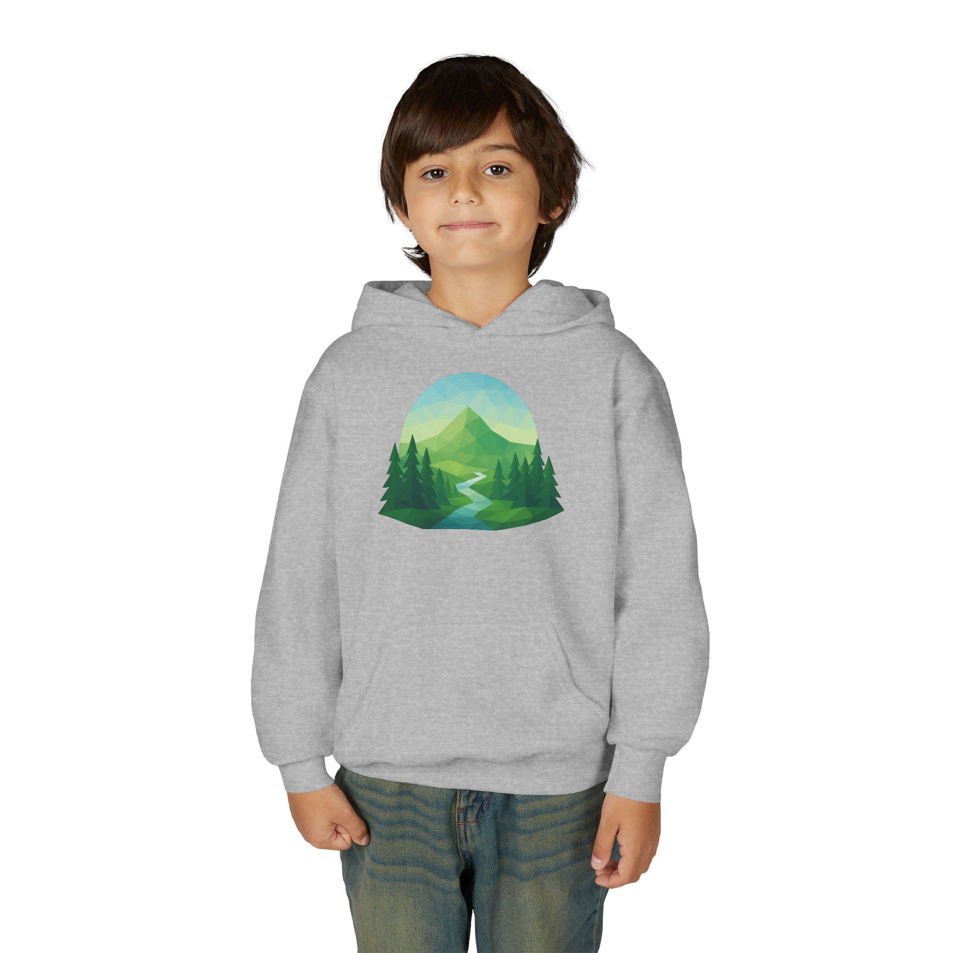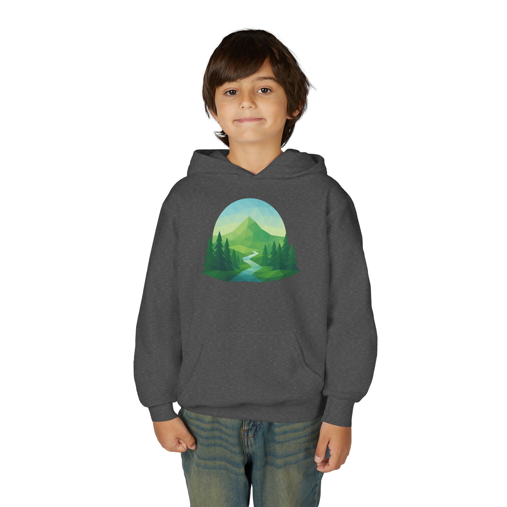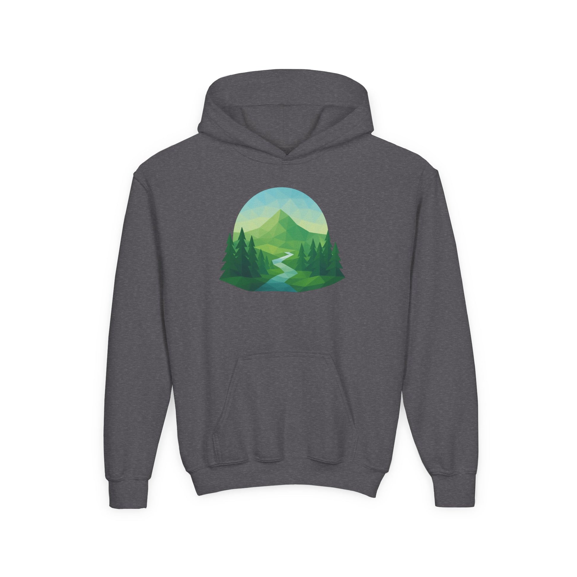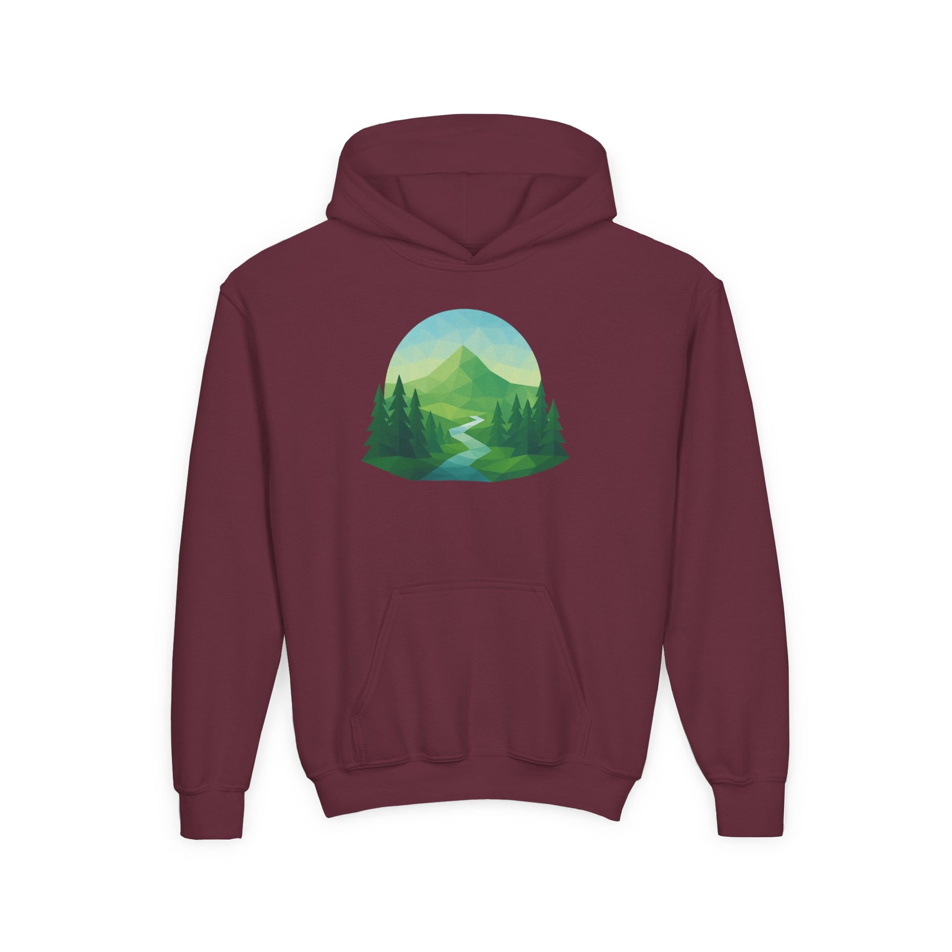 Soft, cozy, and quietly adventurous — this youth hoodie brings the calm of a morning hike into everyday play. A gentle mountain scene flows across the chest: misty peaks, a winding river, and tall pines rendered in soothing greens and blues. It’s built for movement and mud-streaked returns from the trail, with a roomy kangaroo pocket to warm small hands and a medium-weight knit that holds its shape through washes and play. Embroidery options for chest accents and crisp DTF wrist prints add thoughtful detail while the twill necktape prevents stretching at the back of the hood. For kids who collect pebble stories and prefer backpack snacks over screens, this hoodie becomes a quiet companion for explorations, campfire tales, and cool mornings at the campsite or schoolyard.