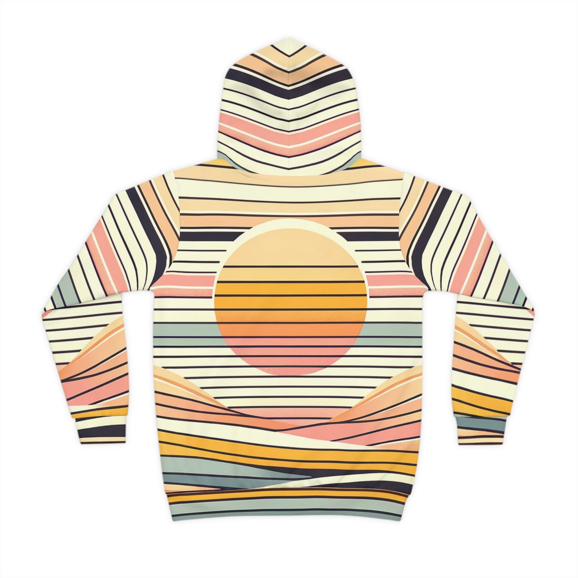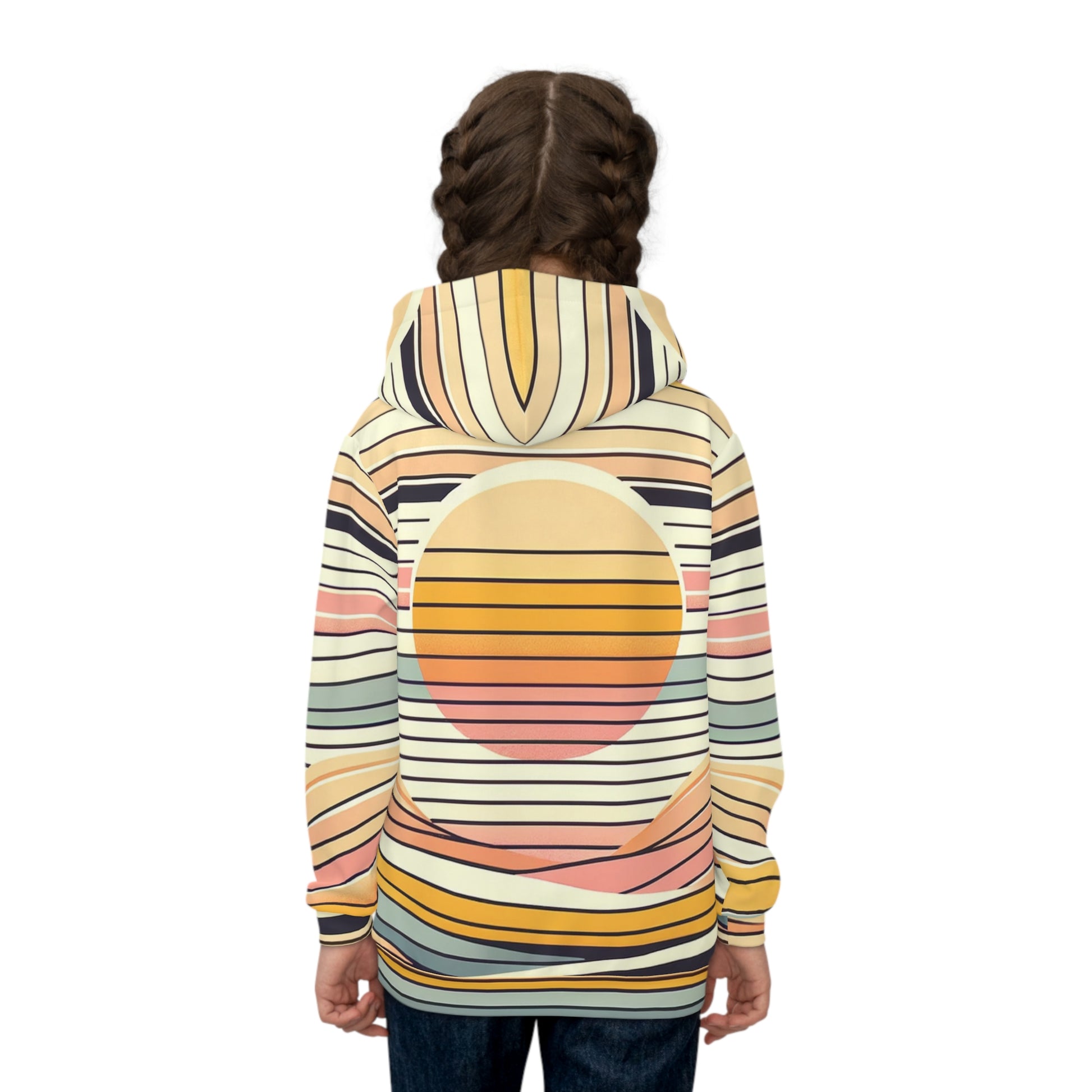 Warm, nostalgic, and playful — this children's hoodie wraps little adventurers in a sunset of soft stripes and gentle curves. The all-over design blends muted corals, golden yellows, dusty blues, and cream tones into a retro landscape that feels like a quiet evening at the beach or the end of a long summer day. Lightweight and stretchy, the hoodie moves with active kids while the double-layer hood and kangaroo pocket hold secret treasures and small hands. It sits comfortably over play clothes for park days, cozy storytimes, or relaxed family outings — a piece that reads like a memory rather than just another layer of clothing.