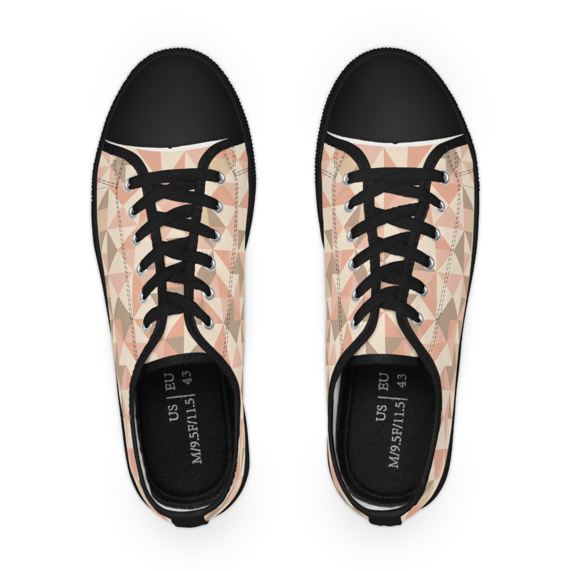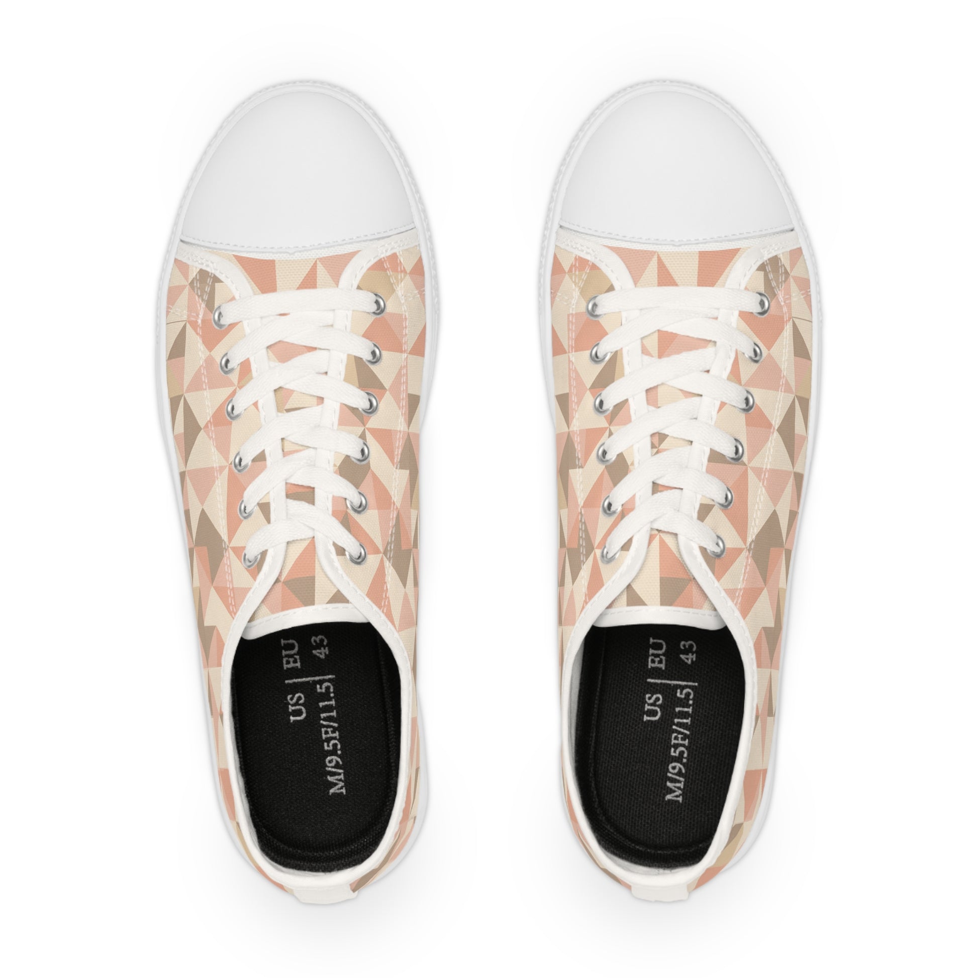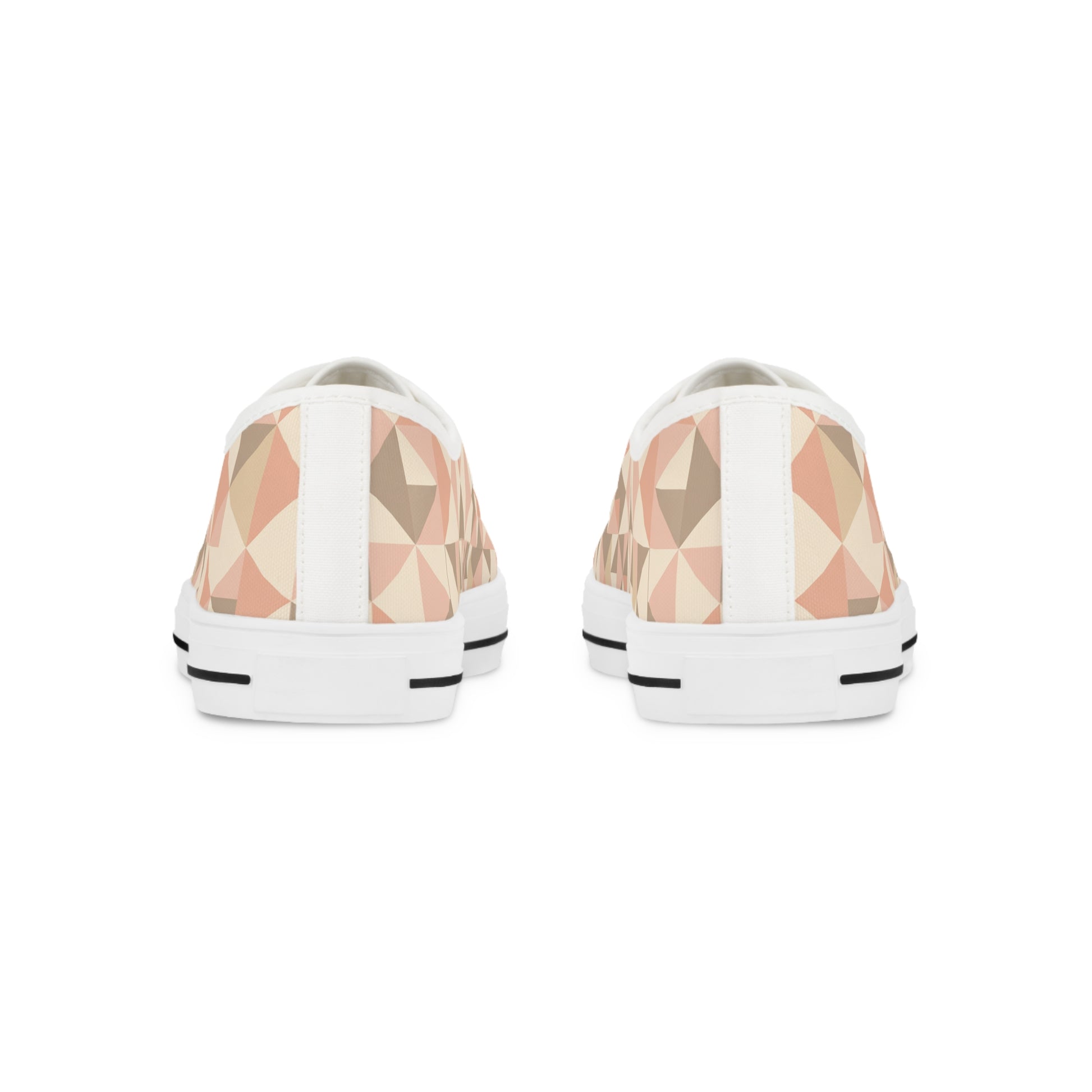 Lightweight, creative, and quietly bold—the Blush Mosaic Low-Tops bring geometric art to your everyday moves. These canvas sneakers feature an all-over print in blush, peach, and taupe, wrapping your feet in modern pattern from every angle. Pleather toes and metal eyelets add polish and durability, while hi-poly memory foam insoles and an EVA sole cushion every step. Slip them on with white laces for a casual-artsy vibe that stands out without shouting. Pair them with cropped jeans, linen trousers, or a breezy dress for an effortless, expressive look.