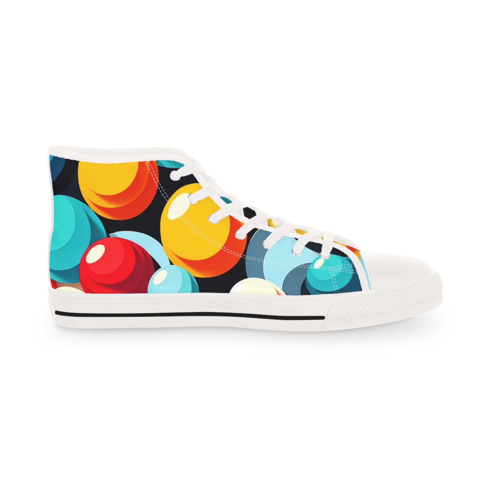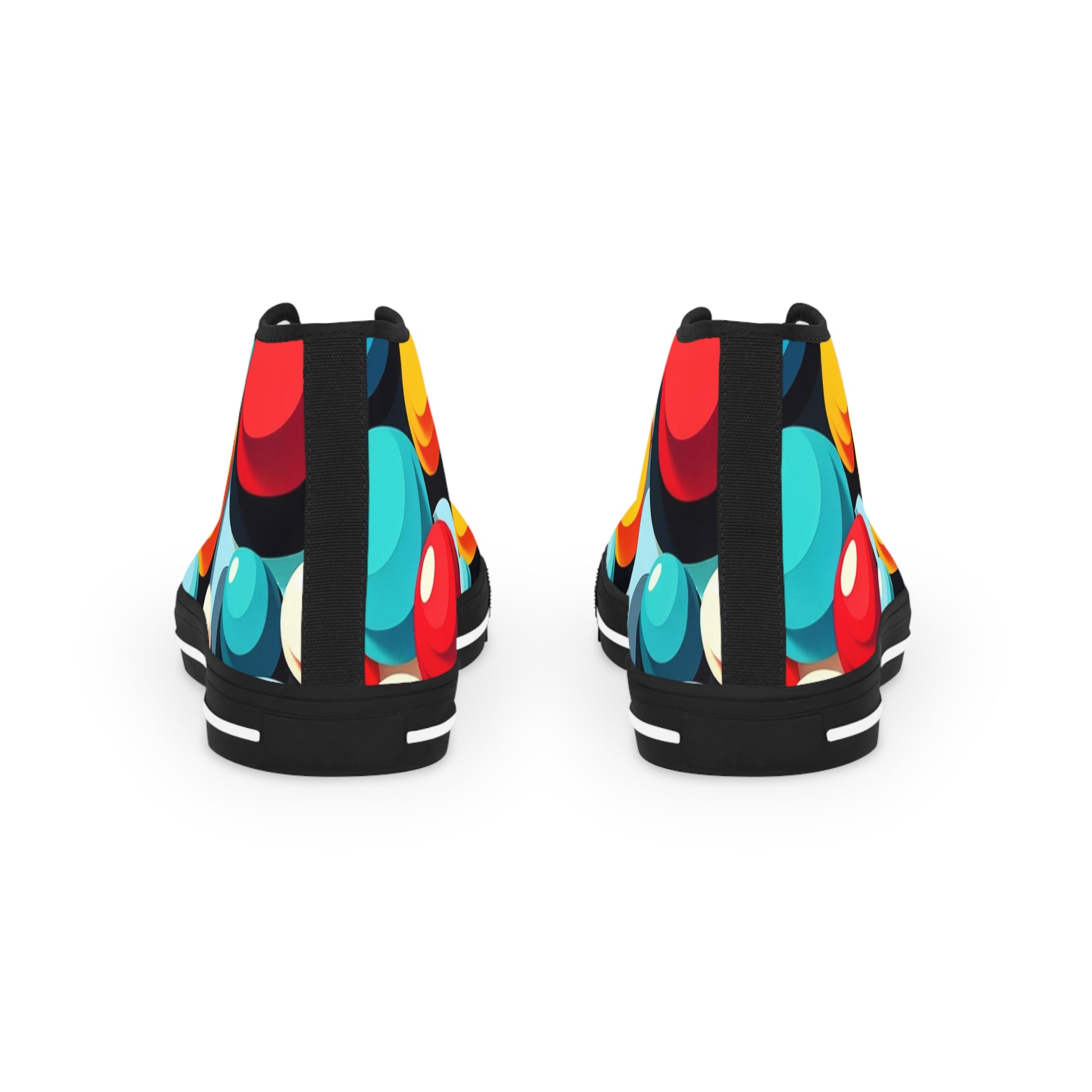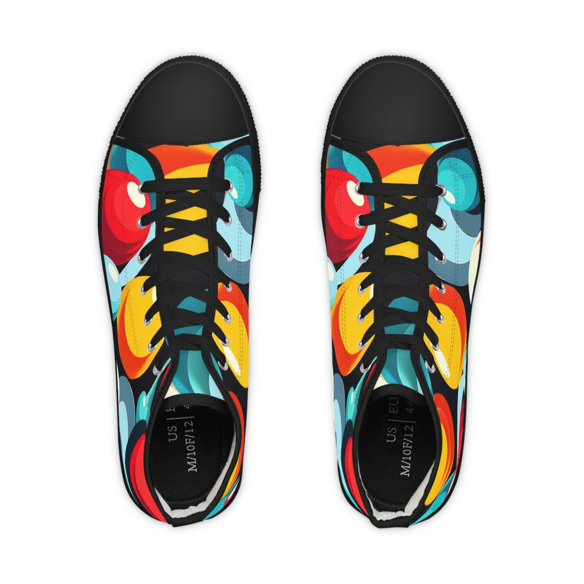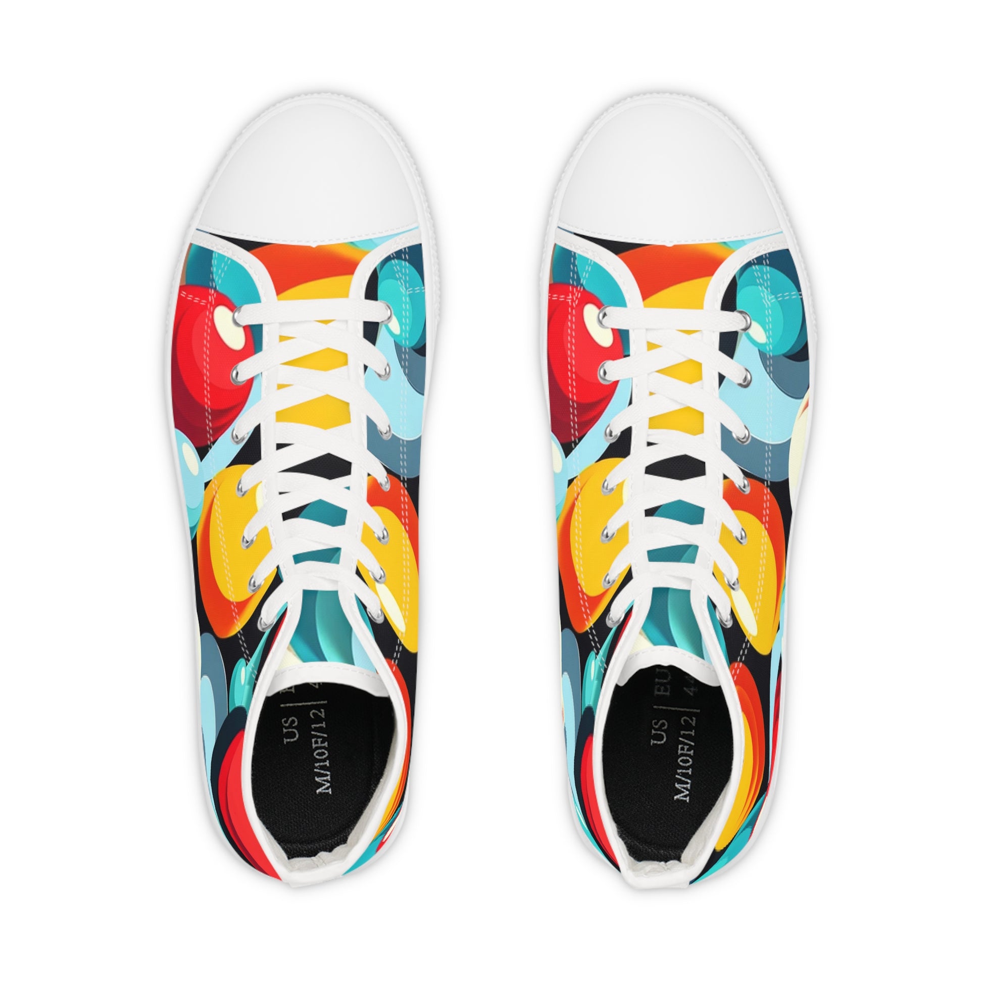 Bright high-top sneakers that bring upbeat energy to everyday steps. The canvas upper features a playful, retro-inspired bubble pattern in vivid reds, yellows, teals and blacks that wraps fully around the shoe — sides and tongue included. A pleather toe cap and sturdy rubber outsole stand up to city streets, while EVA memory-foam insoles cushion and absorb shock for long walks or standing days. Metal eyelets and classic lacing add a clean, durable finish. Wear them to add color to casual outfits, weekend outings, or creative workdays — they feel lively underfoot and look like an art piece in motion.