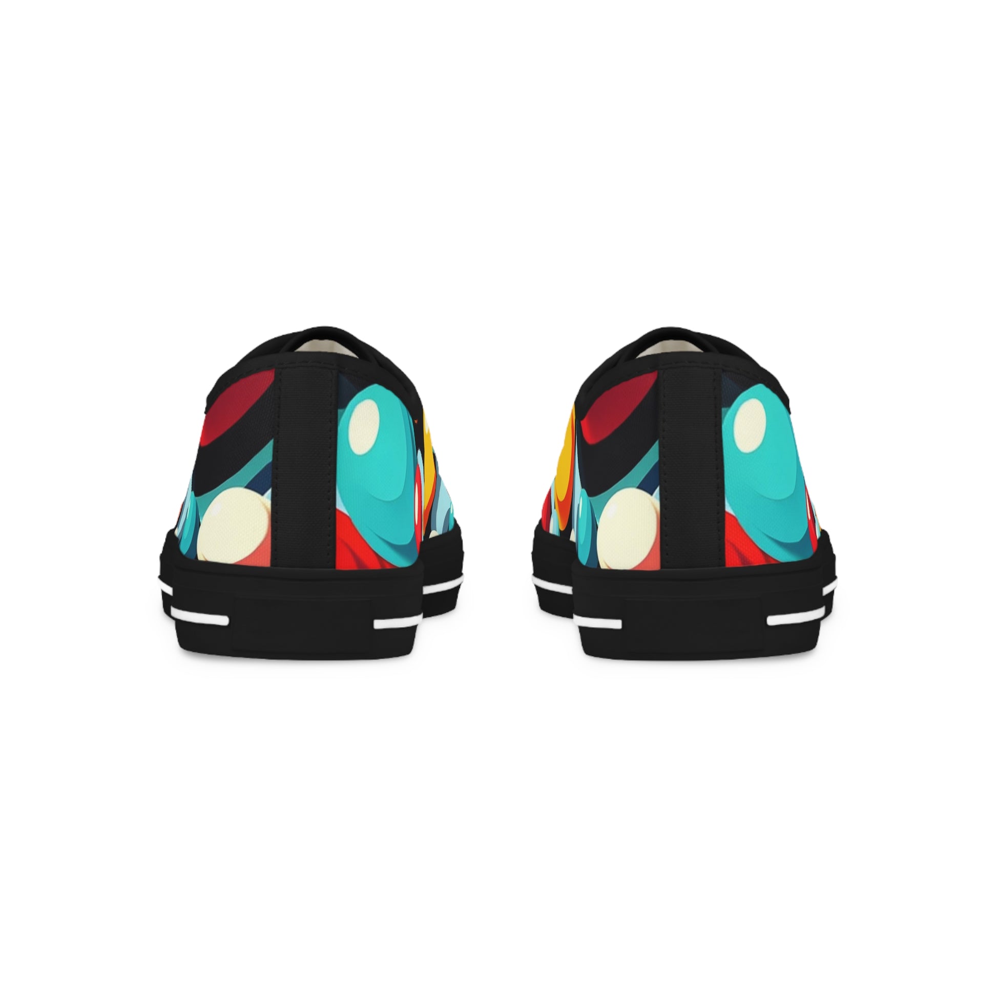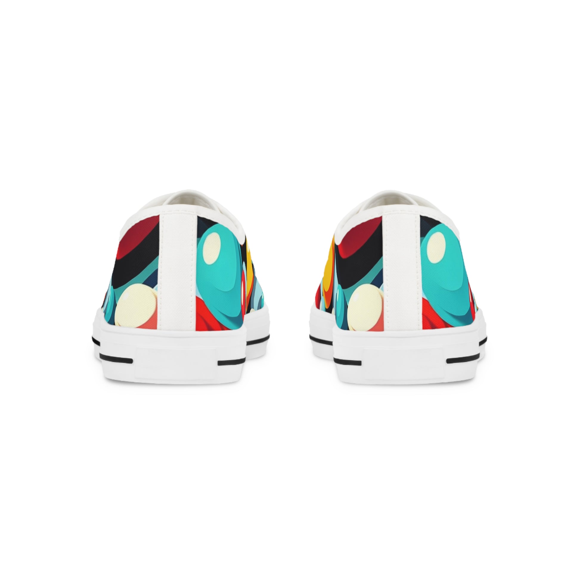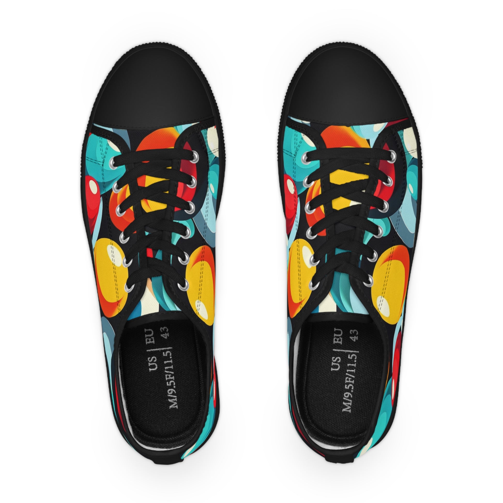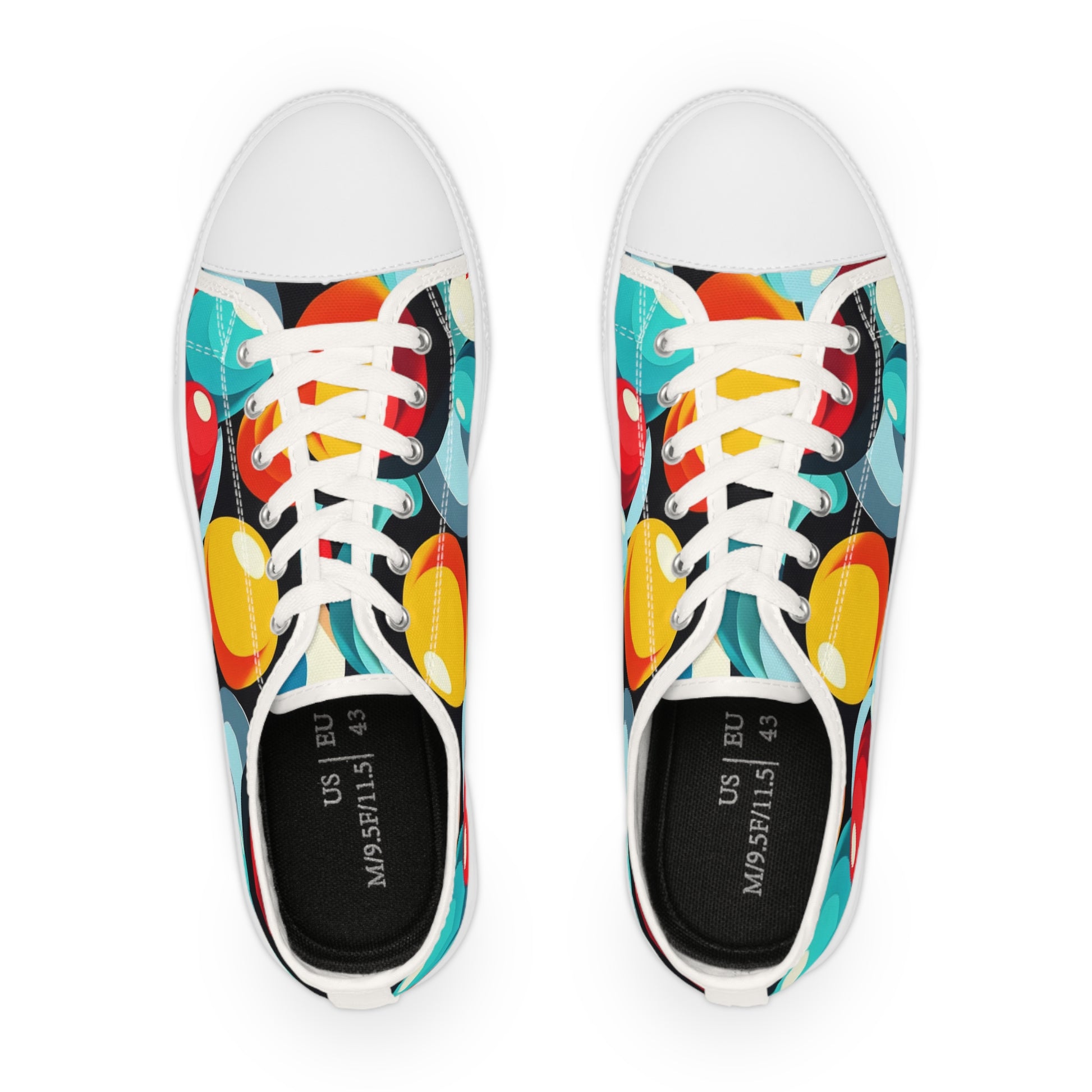 Bright, playful low-top sneakers that bring a burst of color to every step. The full wraparound print shows glossy, overlapping spheres in bold reds, teals, yellows and blues against a dark backdrop, creating a lively, contemporary look. Lightweight polyester canvas and cushioned memory foam insoles keep feet comfortable through long days on the move. Reinforced pleather toe and durable rubber outsole add practicality for everyday wear, while metal eyelets and contrast decoration give a clean, finished feel. These sneakers run slightly large — size down if you prefer a snug fit.