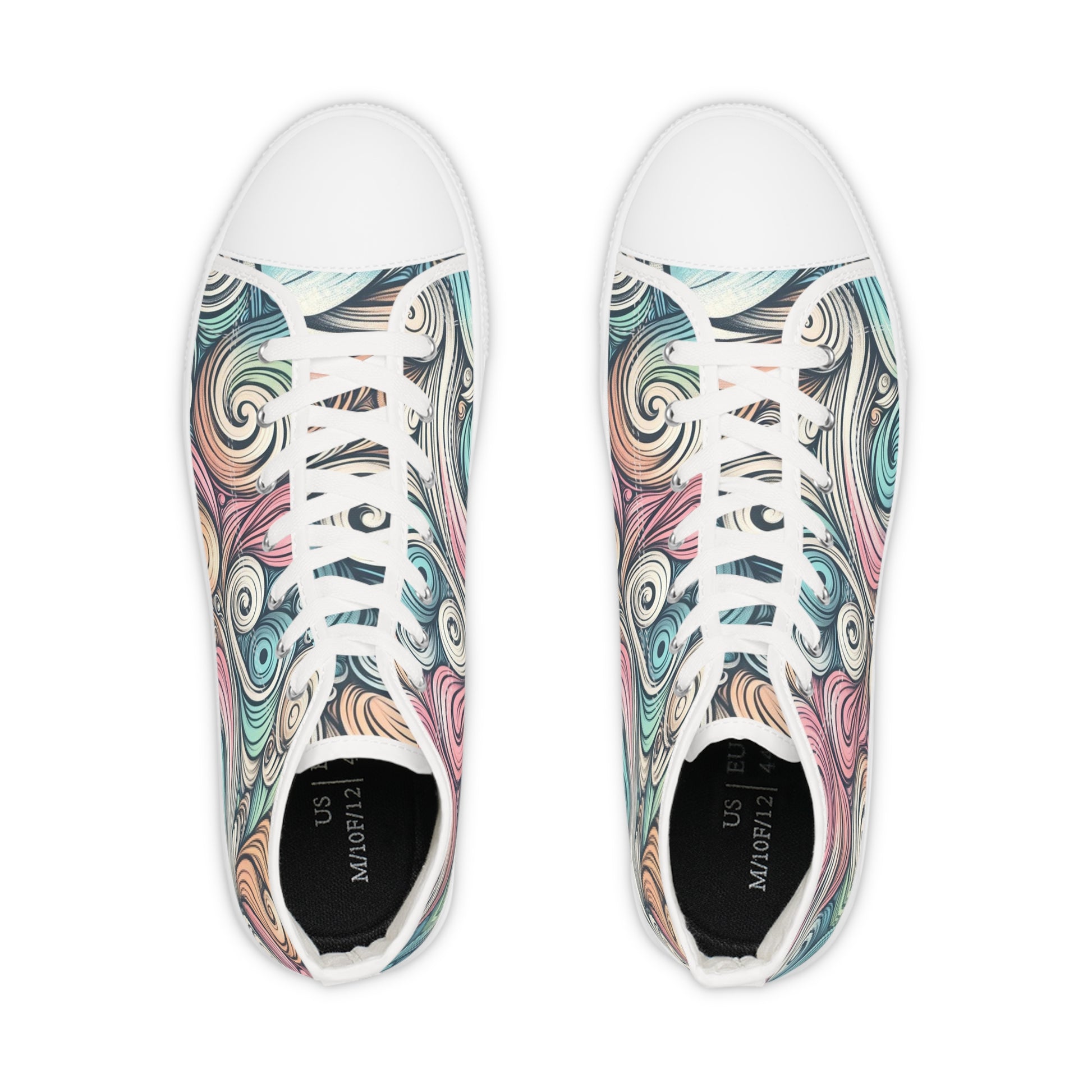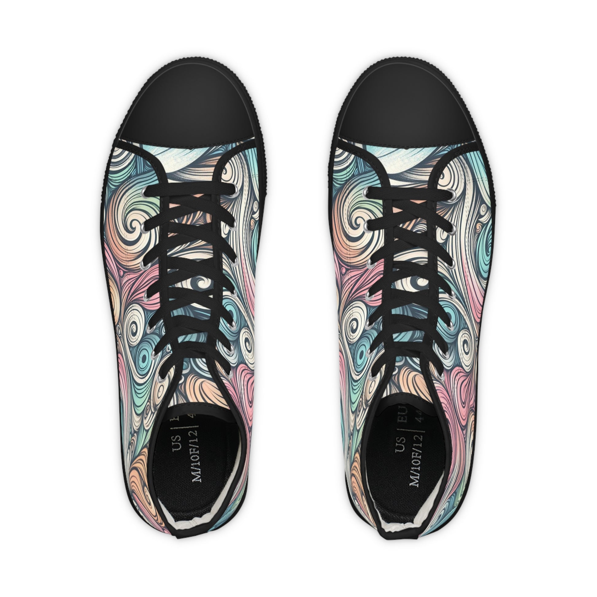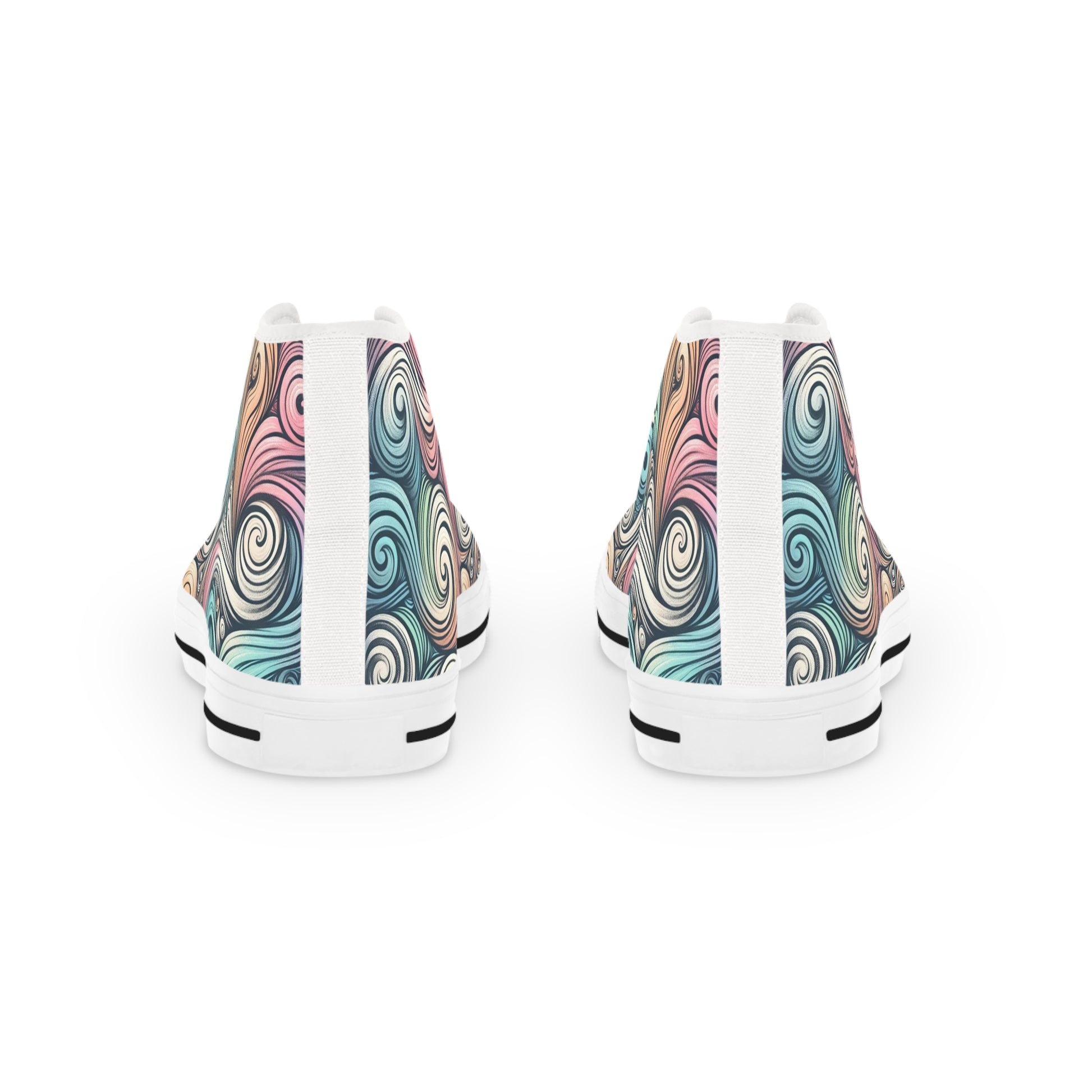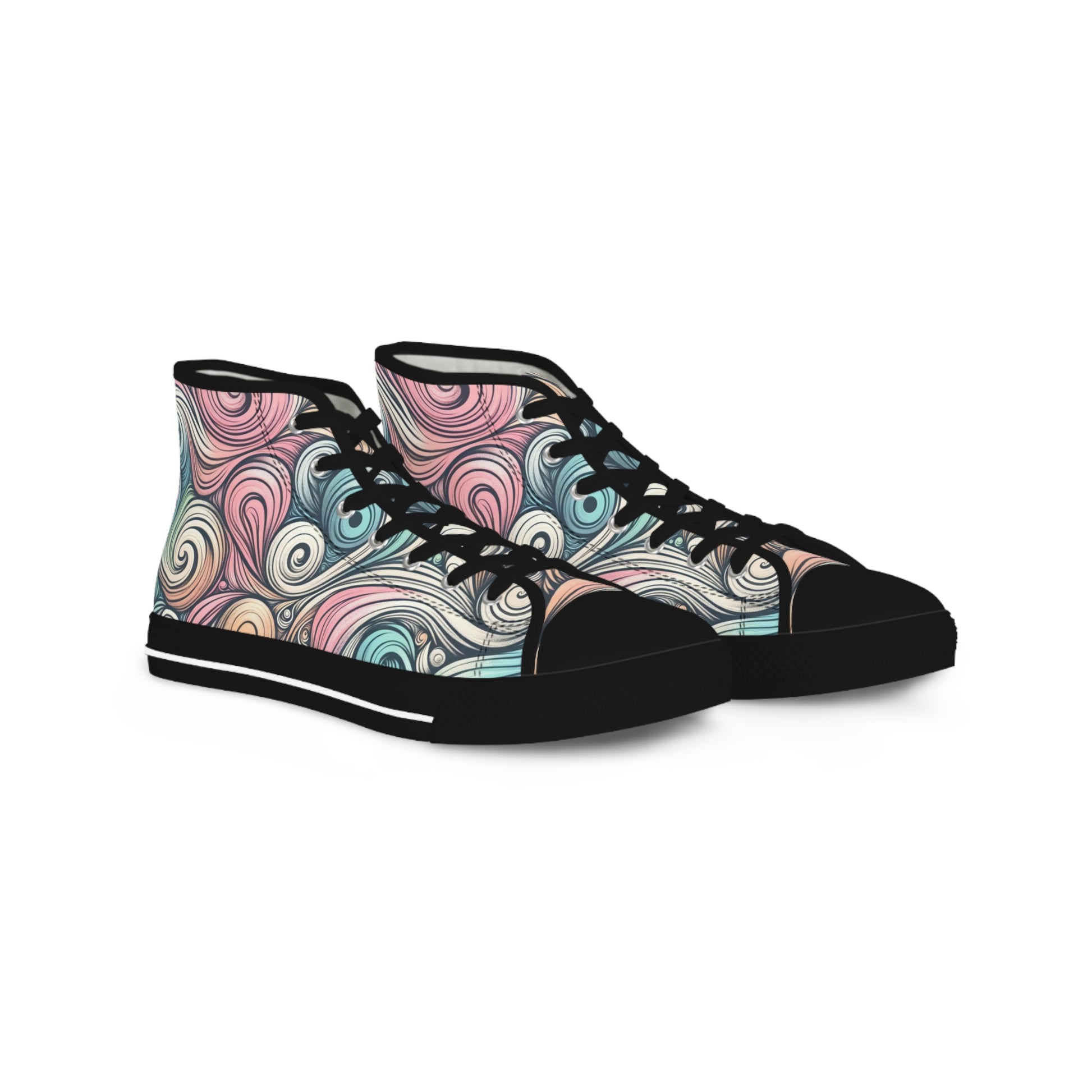 Step into movement and color. These high-top sneakers wrap your feet in a swirling, hand-drawn pattern of pastel teals, rose, and cream — like a street-art sketch come to life. The canvas feels light and breathable while the pleather toe and durable rubber outsole stand up to daily wear. Memory-foam EVA insoles cushion each step, so long walks through markets, creative workdays, or late-night meetups stay comfortable. They speak to people who mix art and everyday life, who layer vintage finds with statement pieces and appreciate subtle, wearable creativity.
