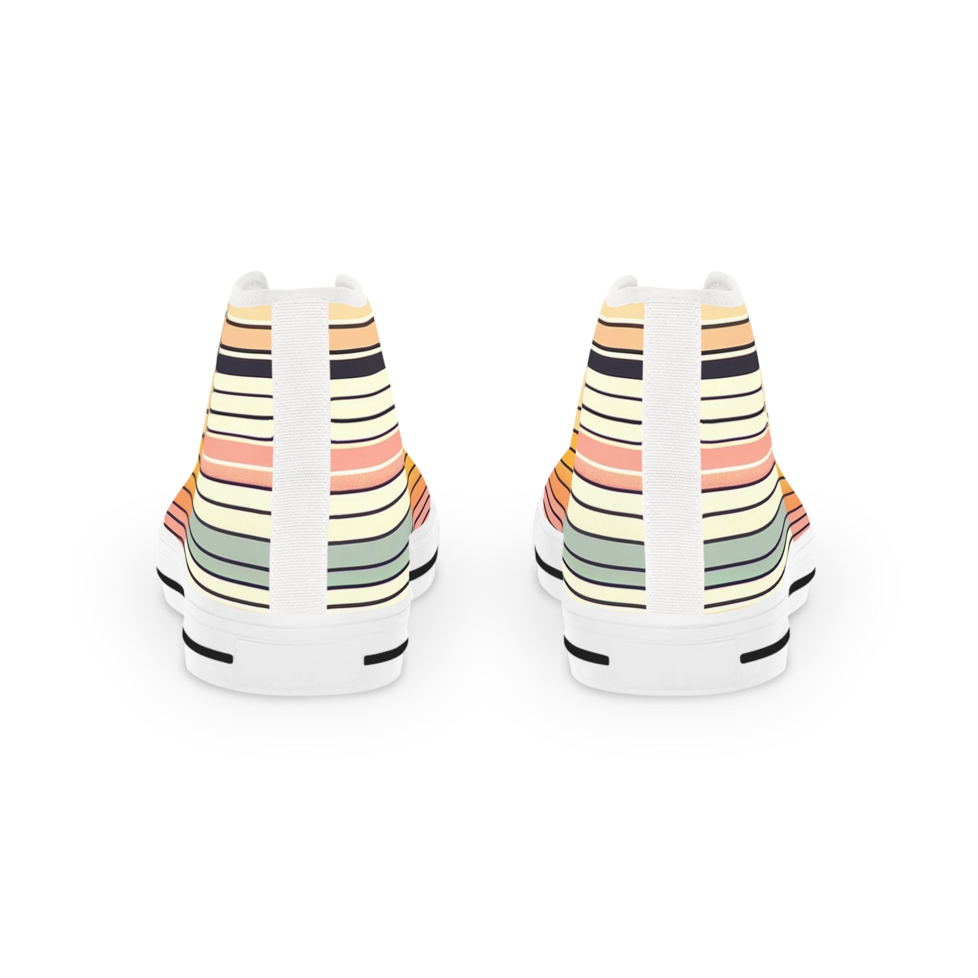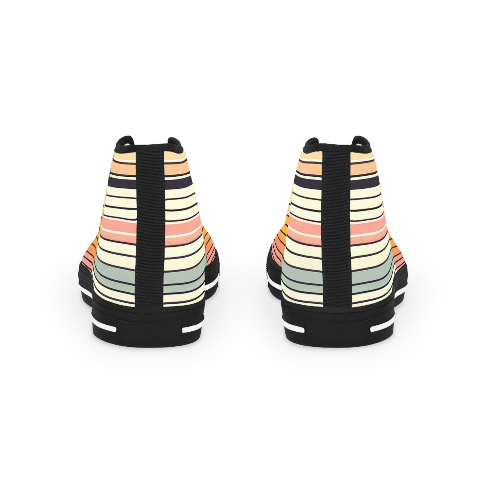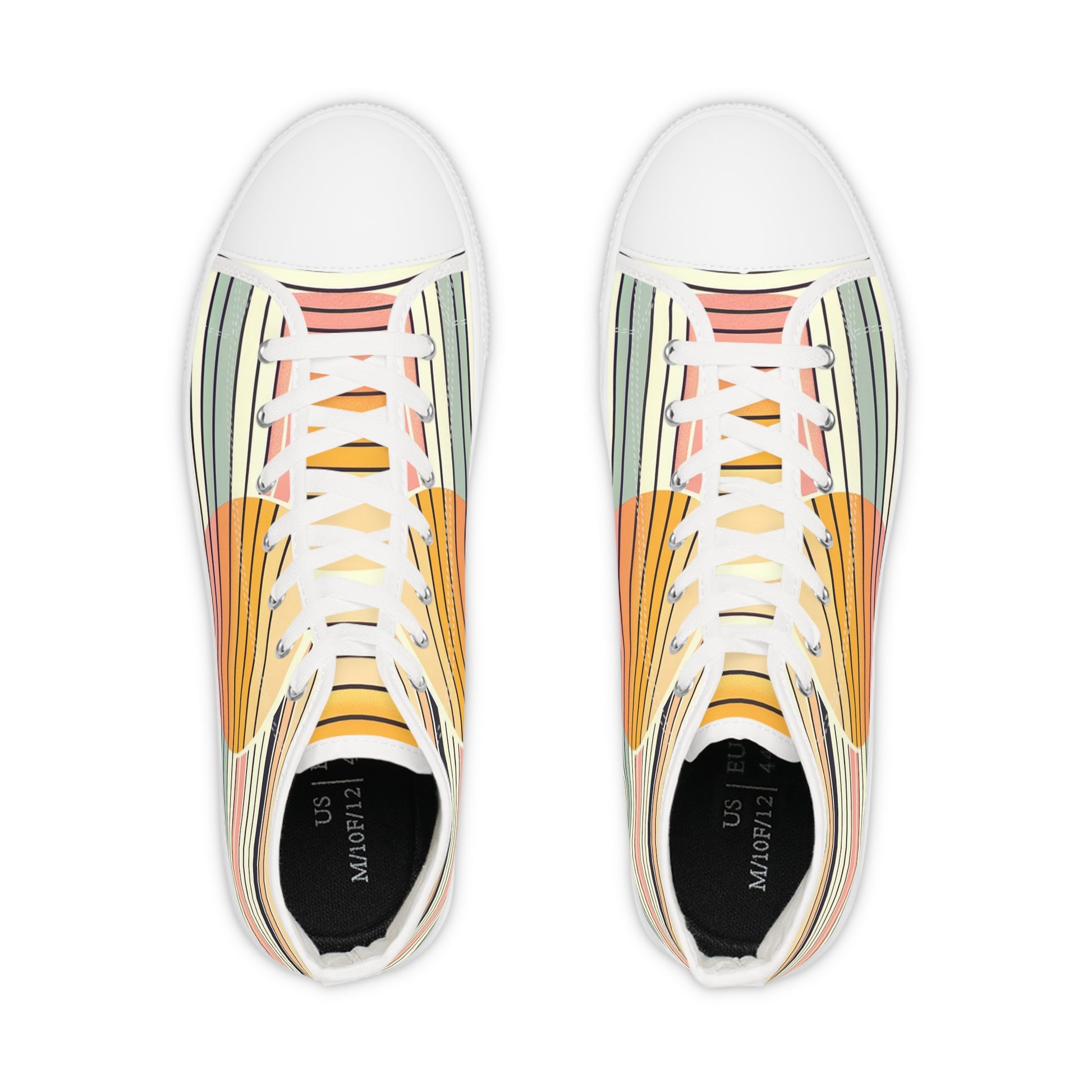 Step into sunlit streets with these high-top sneakers that feel like a retro summer memory. Soft polyester canvas wraps your foot with a fine weave texture and foamed lining, while EVA memory-foam insoles cushion each step. The design carries full wraparound artwork: warm, overlapping sun shapes and narrow horizontal stripes in muted peach, apricot, sage and cream—an understated vintage vibe that pairs with denim, linen, or shorts. Metal eyelets and a pleather toe add rugged details where wear matters most. Breathable construction keeps feet comfortable during long walks, and the durable rubber outsole holds up to everyday use. These sneakers bring a gentle, nostalgic warmth to casual outfits and slow afternoons outdoors.