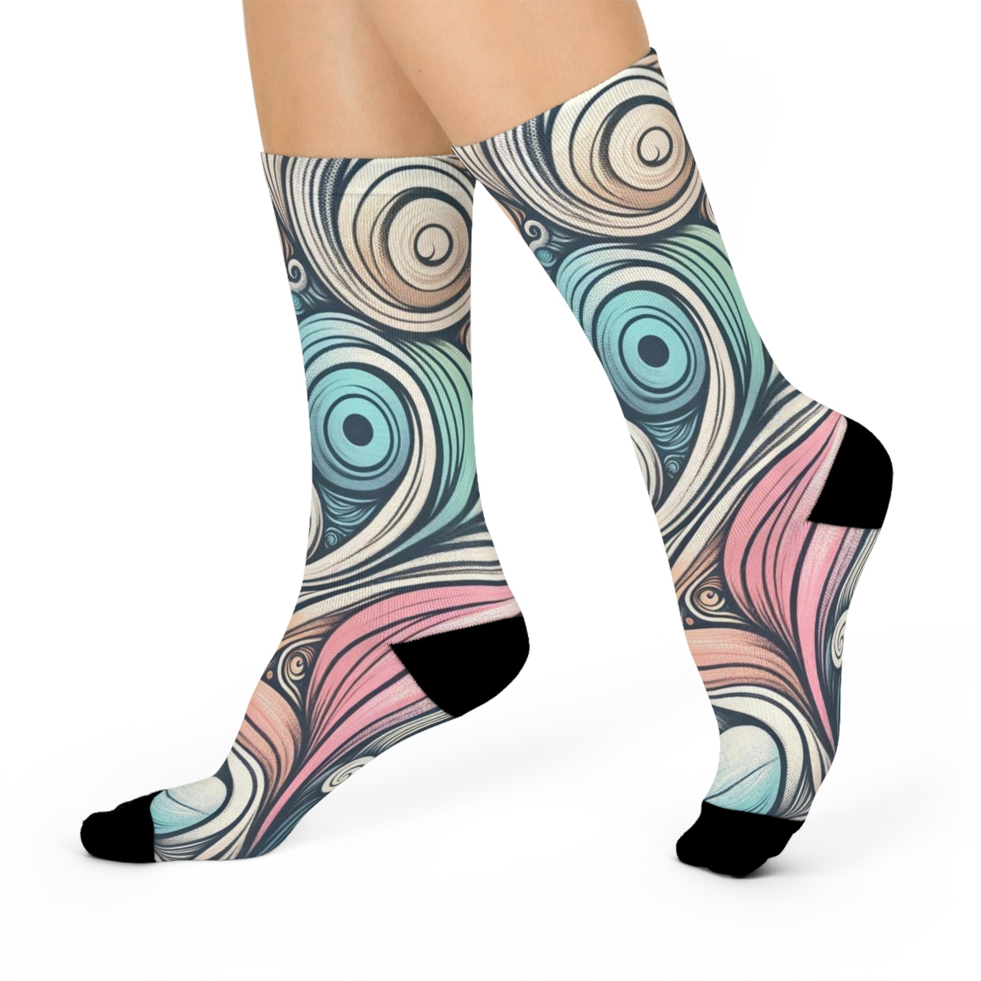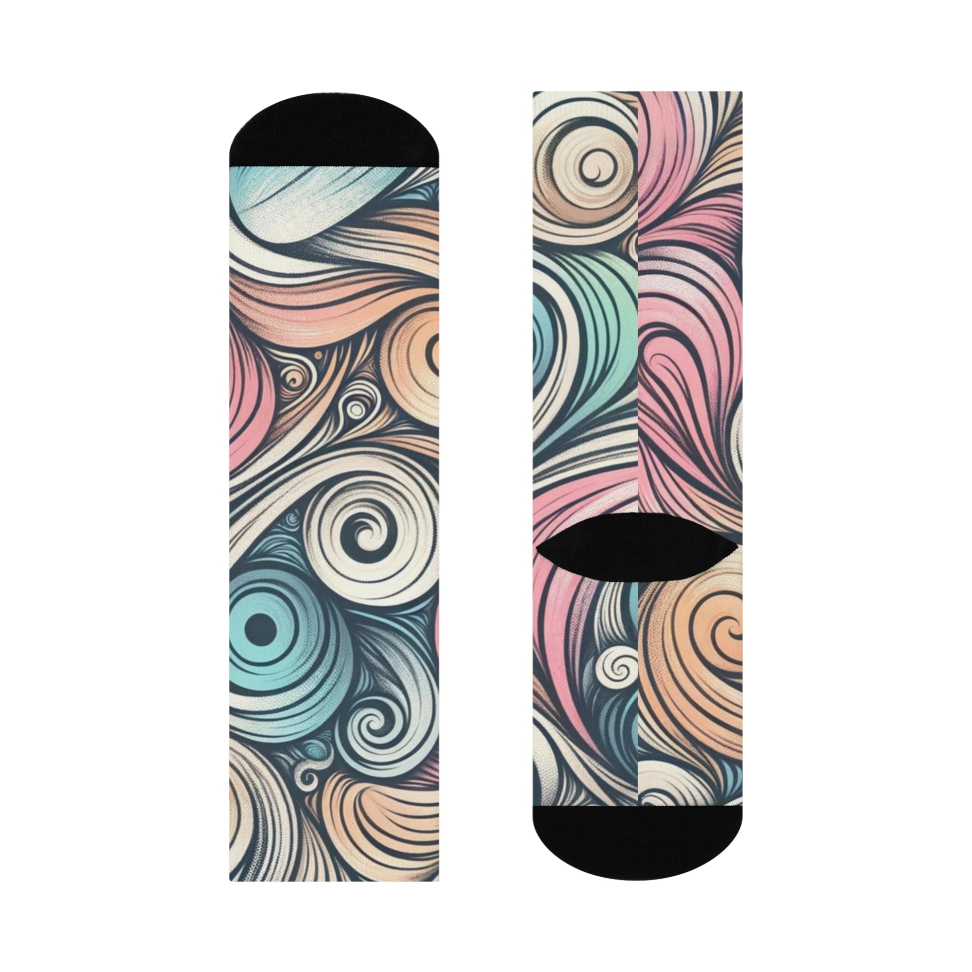 These cushioned crew socks carry a soft, swirling pattern in muted teals, blush and sand — a quiet statement for days when you want color without shouting. The all-over print wraps around the leg and foot, while black heels and toes give a clean, finished look. Thick, 200-needle knit with cushioned bottoms keeps feet comfy through long walks, desk days, or lazy mornings. Stretchy, smooth fabric holds the vibrant print and fits a wide range of sizes, so you can slip them on and go.