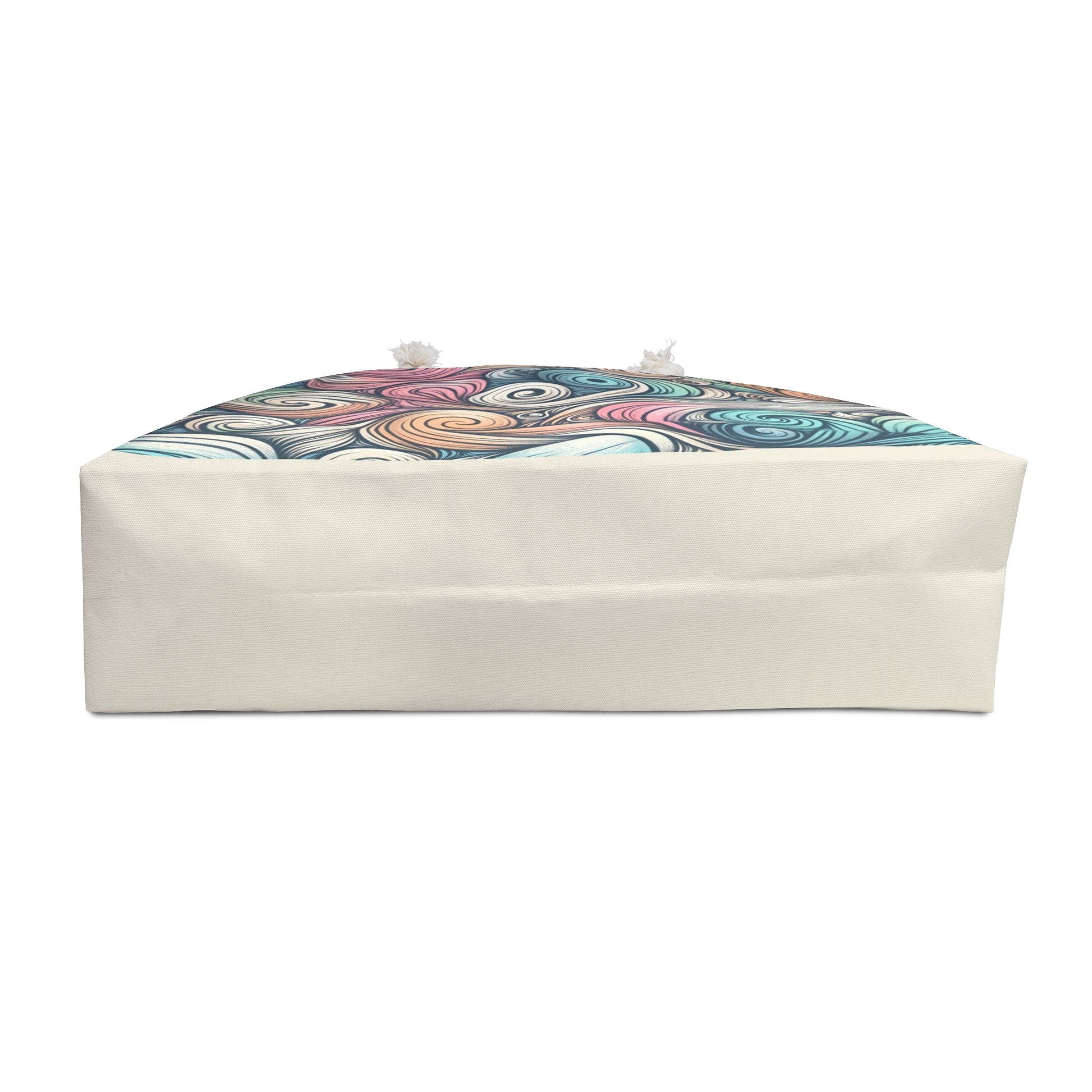 Salt air and slow mornings. This roomy Weekender holds everything you pack for a coastal escape or a weekend of wandering: towels, a paperback, sunscreen, and a light jacket. The surface shows a hand-drawn swirl pattern in muted sea glass tones — teals, sandy golds, dusty rose — that feels both playful and quietly sophisticated. Cream rope handles sit comfortably on the shoulder while the T-bottom keeps the bag upright when you drop in groceries or beach gear. Lined with a soft cream sheeting, it’s built to travel from car roof racks to market stalls and back home, carrying the kind of stories you make when you slow down.