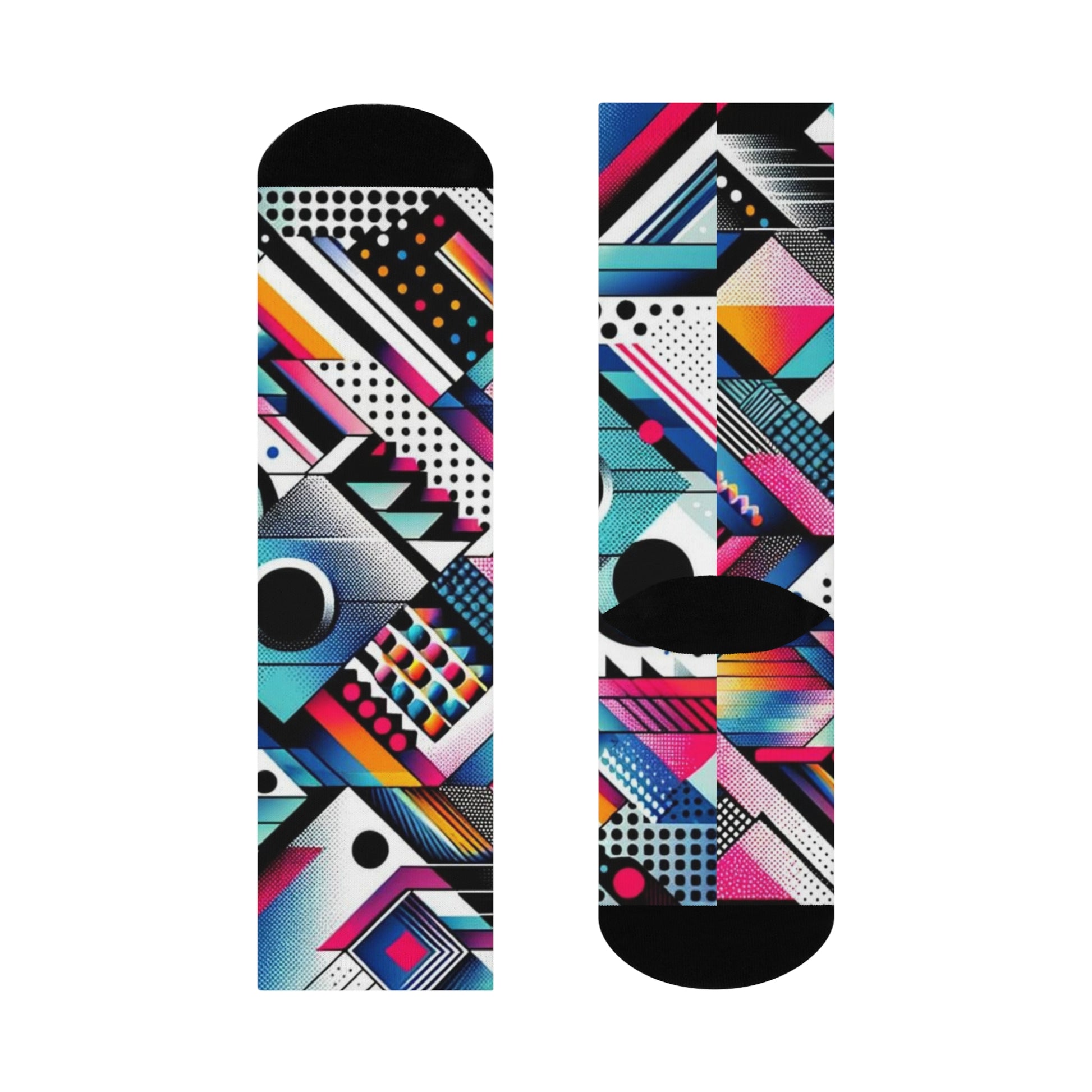 Bright, bold, and undeniably playful — these cushioned crew socks bring an energetic art-statement to every step. The all-over geometric print bursts with neon pinks, cyan, and sunset oranges layered over crisp black-and-white accents. Cushioned bottoms and a 200-needle knit give them a soft, supported feel for long days on your feet, while the stretchy, smooth fabric hugs comfortably from calf to toe. Slip them on with sneakers, ankle boots, or a skirt to add a punch of color to city commutes, creative studio days, or weekend hangouts. They hold their color and shape wash after wash thanks to high-quality printing and a durable poly-blend knit — designed to look loud without losing comfort.