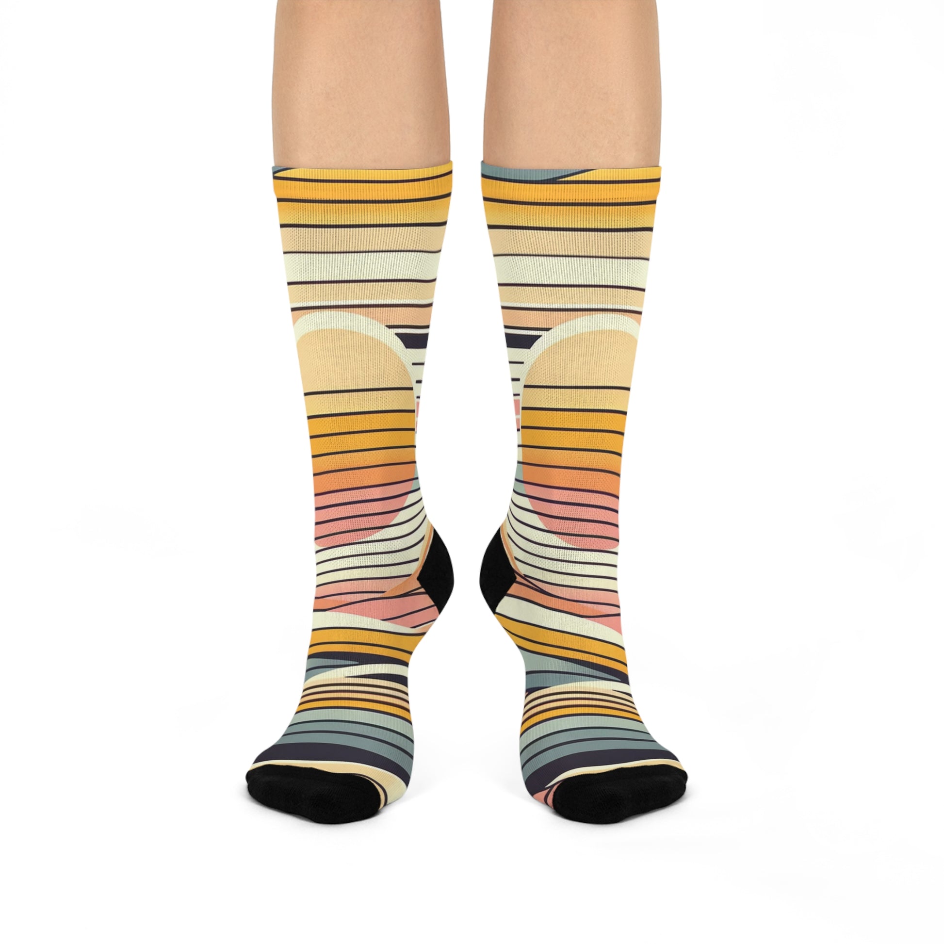 Slide into cozy color and steady comfort. These cushioned crew socks wrap your feet in a soft, stretchy knit printed with warm, retro-inspired sun and stripe motifs. The all-over print keeps the design vivid from cuff to arch while the reinforced black heel and toe add subtle contrast. With a thick, cushioned sole and a smooth, flexible feel, they move with you whether you’re on your feet all day or lounging at home. They fit a broad range of sizes and hold color and shape through regular wear, bringing a playful vintage vibe to everyday outfits, hikes, or slow weekend mornings.