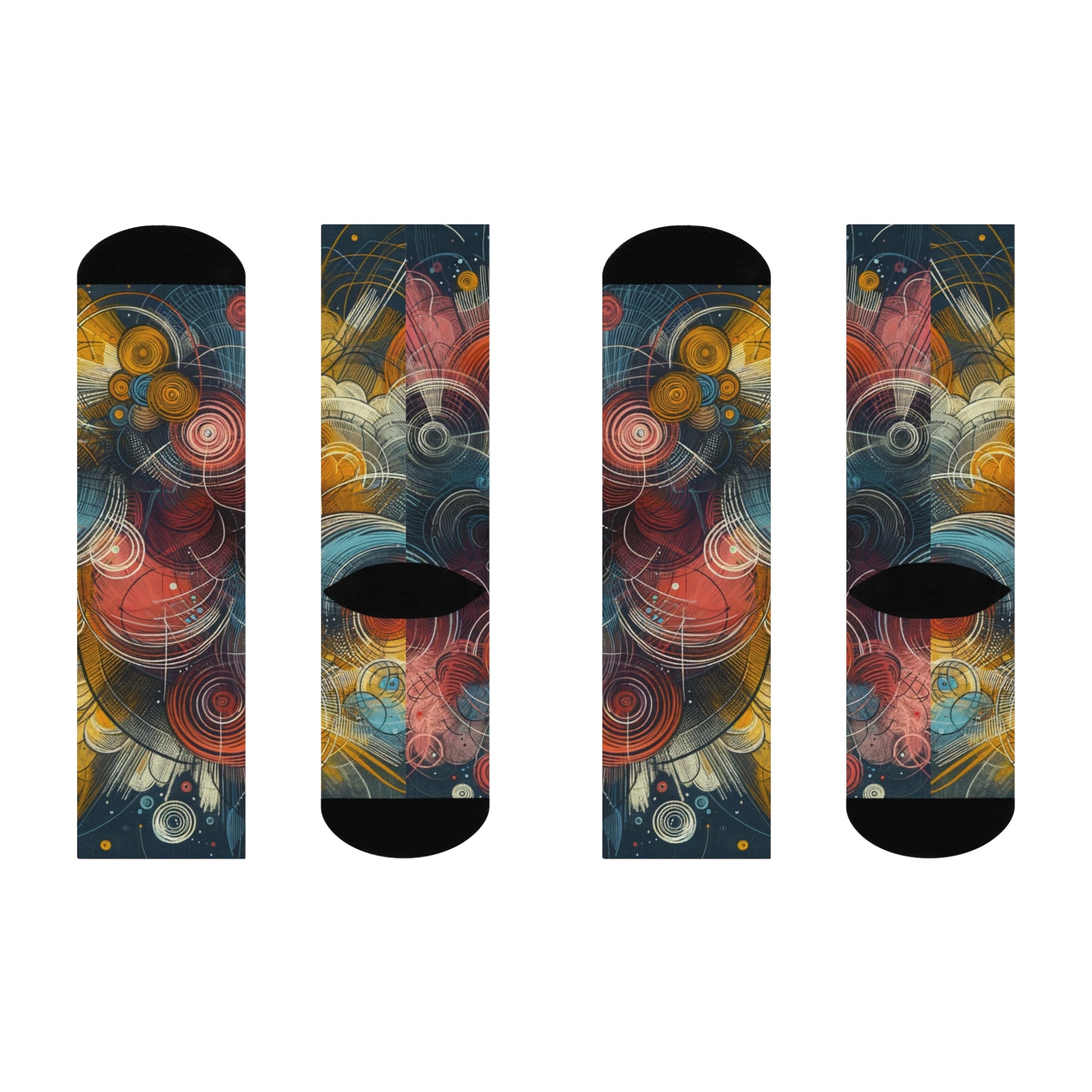 These cushioned crew socks bring color and movement to your everyday rotation. The all-over abstract design layers swirling orbs and soft bursts of color — deep navy grounds pops of rust, gold and teal for a look that feels both cosmic and hand-painted. The mid-calf length pairs easily with sneakers or loafers, while the plush cushioned bottoms and 200-needle knit give a soft, supportive step. Stretchy, smooth fabric holds the vibrant print without fading, and the reinforced black toe and heel add contrast and durability. Wear them on long days that need a little lift, on creative studio mornings, or tucked into boots for a burst of pattern at the cuff.