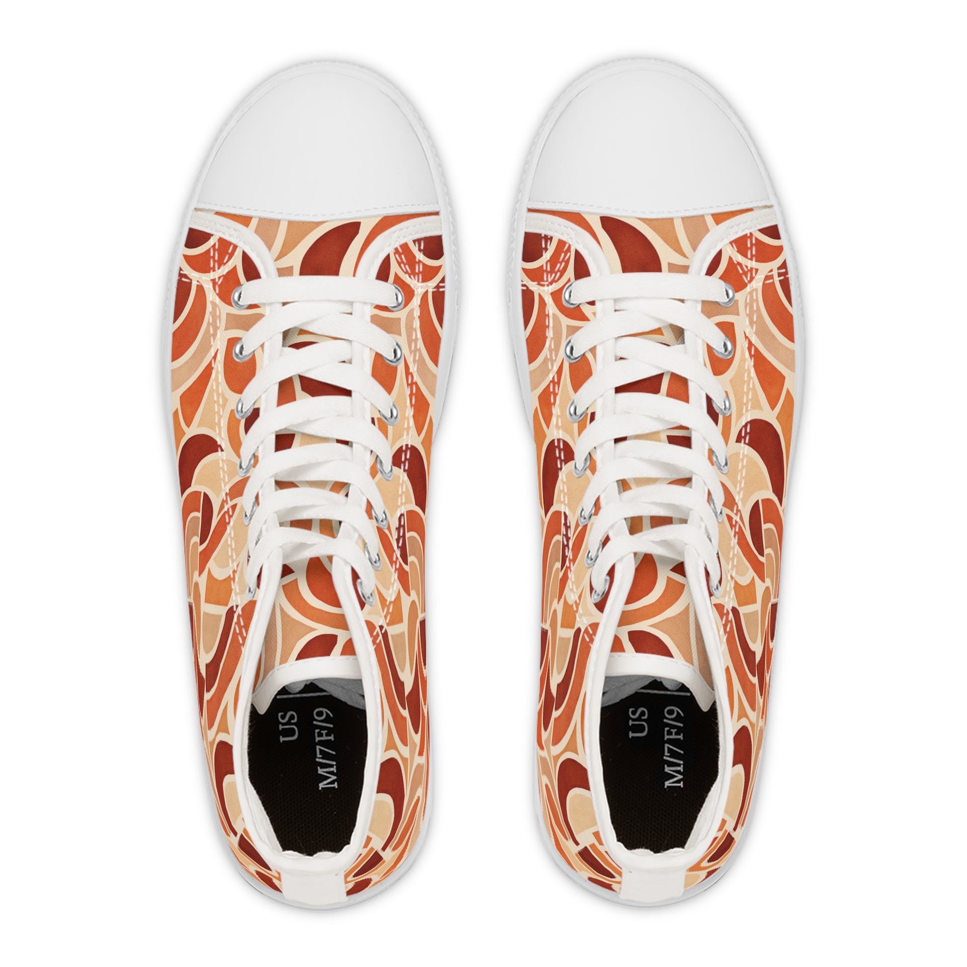 Step into bold, creative comfort with the Sunset Circuit High-Tops. Sunbaked orange, clay, and cream flow across the canvas in retro-inspired curves—playful, artful, and quietly confident. Lightweight and cushioned, these sneakers move with you from coffee runs to art walks and slow weekend city roamings. The rounded pleather toe and durable rubber outsole stand up to daily steps, while memory foam and EVA layers keep feet feeling lively from morning to night. The reinforced ankle collar adds support and style, wrapping you in comfort. Pair them with rolled jeans, a breezy dress, or your favorite coordinated MatchRiot set and let the pattern do the talking.